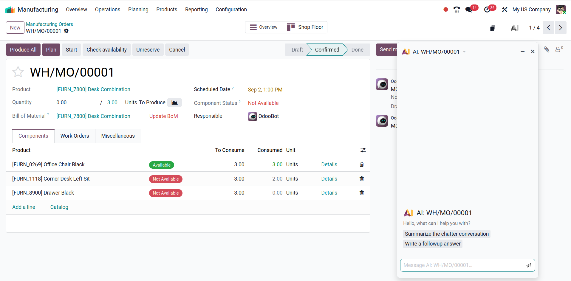 - Odoo’s AI assistant summarizes long chatter threads in the Manufacturing module.