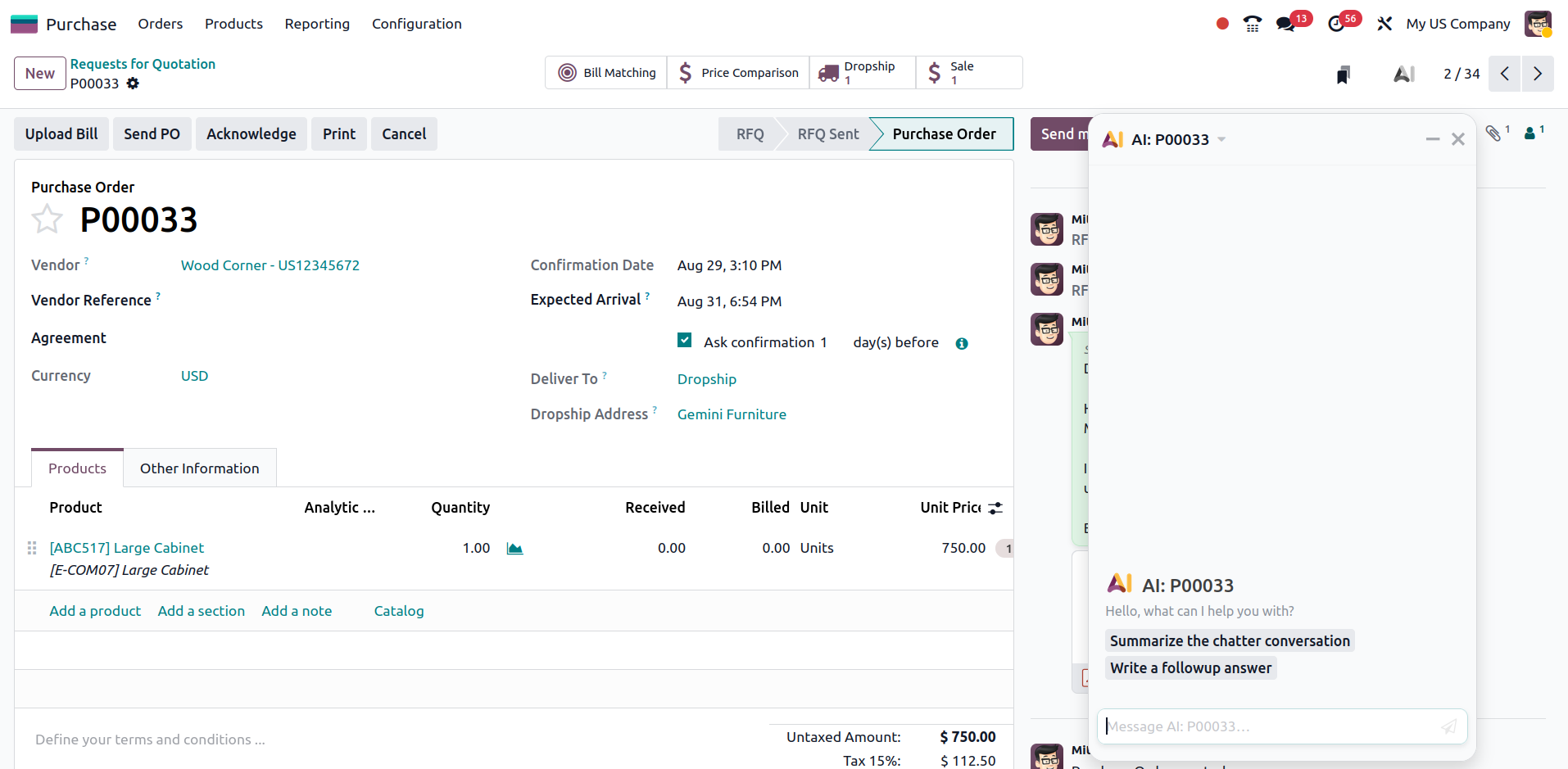 To reduce noise and improve efficiency, Odoo19 integrates AI-powered summarization into Purchase chatter conversations. Instead of scrolling through lengthy threads between procurement teams and vendors, users can now view short summaries that capture the essence of discussions.