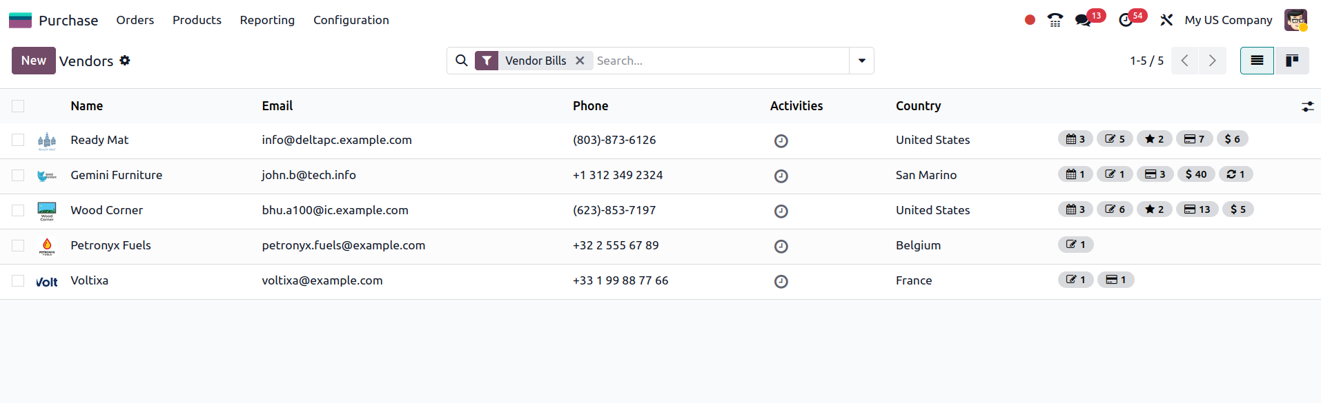 Vendor management gets smarter with Odoo19’s new application_statistics field in the vendor listing view. This field shows icon-based statistics representing vendor-related activities such as meetings, invoices, and purchase history. It provides at-a-glance insights without needing to drill down into multiple reports.