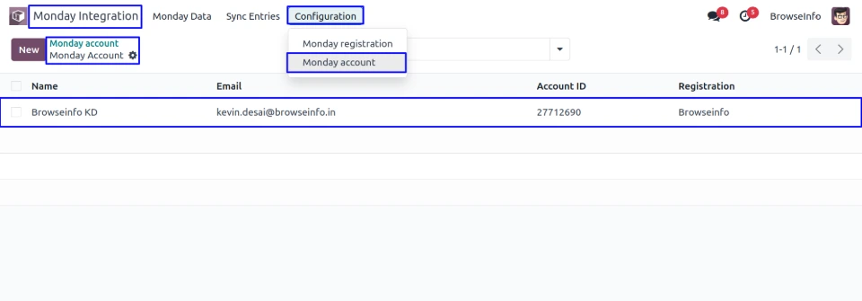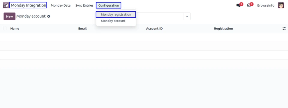 In the Monday Integration module, the user needs to register with a Monday.com account first. As a result, the Registration menu is available under the Configuration section of the Monday Integration module.