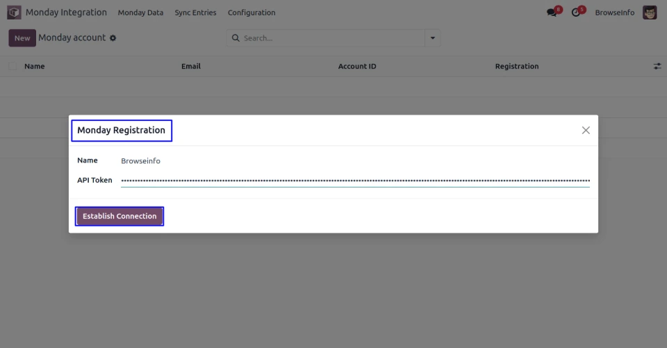 When the user clicks on the Monday Registration menu, a wizard opens. Here, the user must enter their Name and API Token, which is generated in Monday.com. After entering the details, they need to click the Establish Connection button to complete the registration.