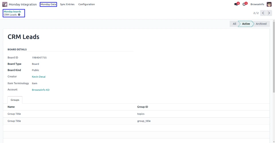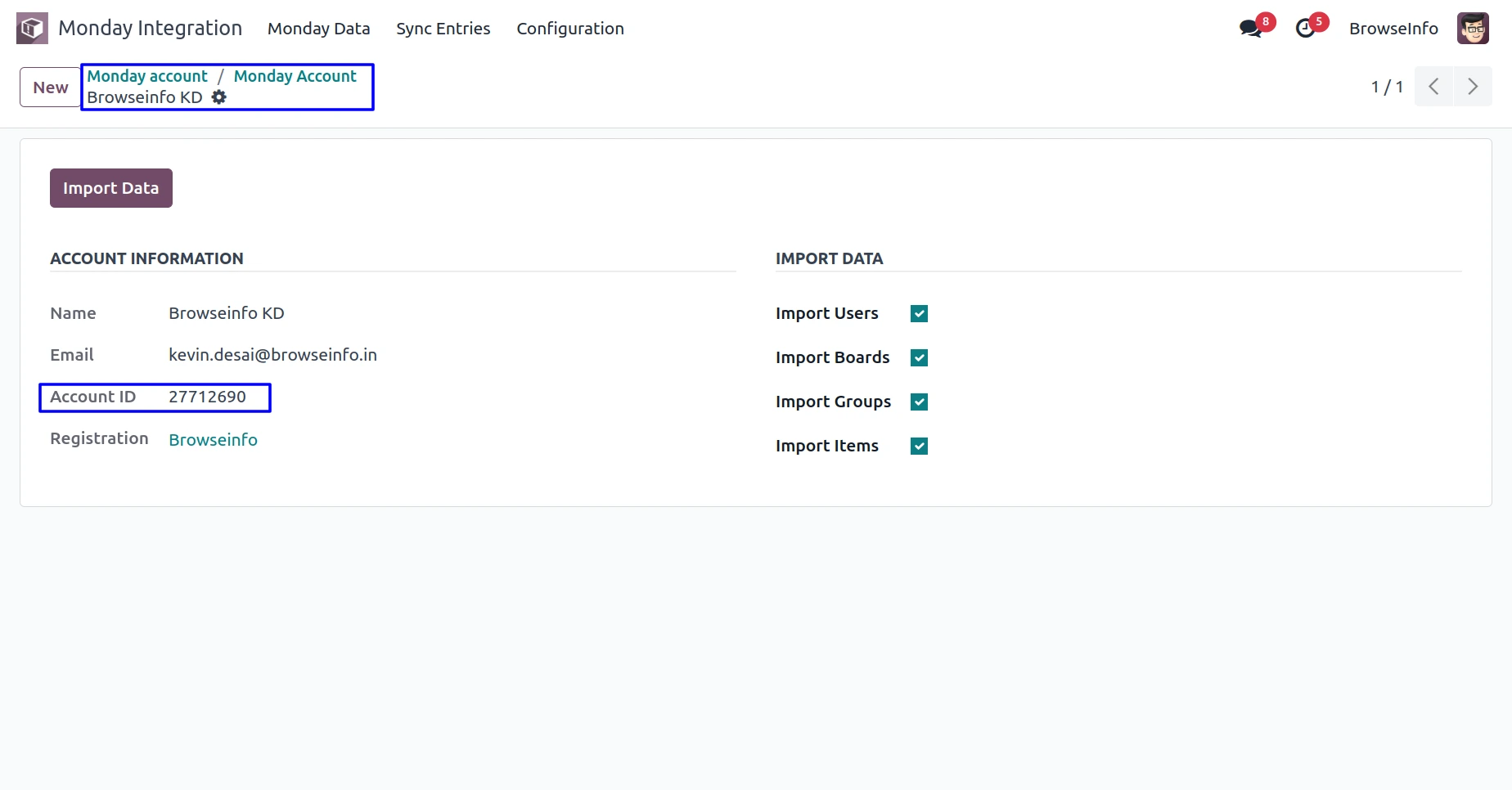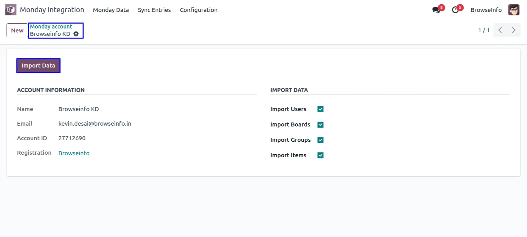 Now, the user clicks on the Import Data button within the Monday Account to import data from Monday.com into Odoo.