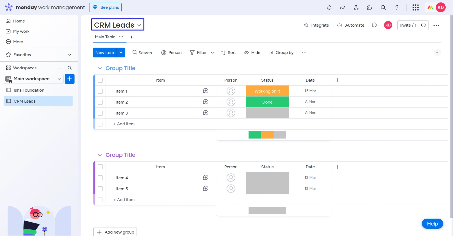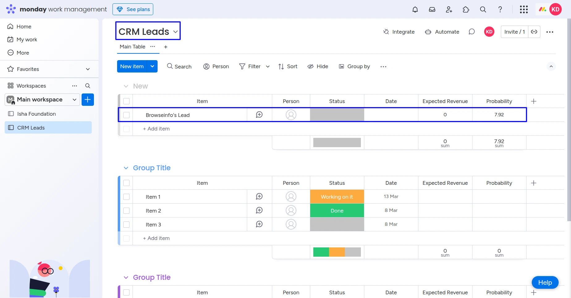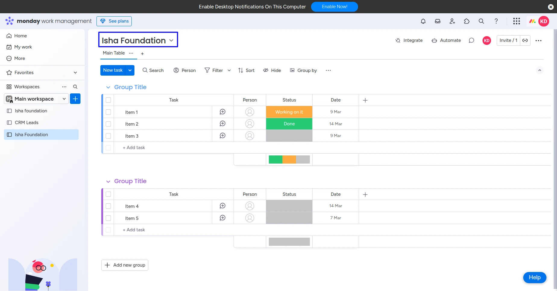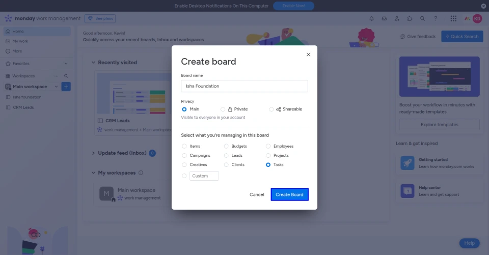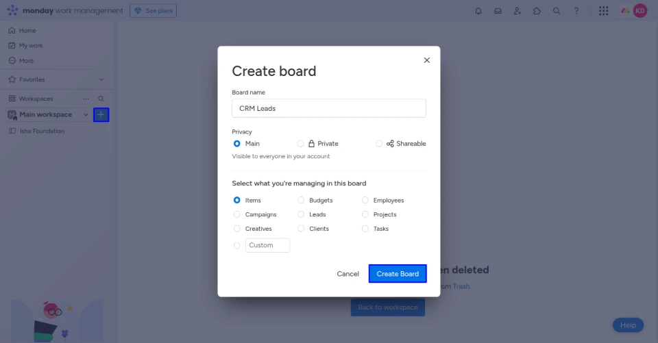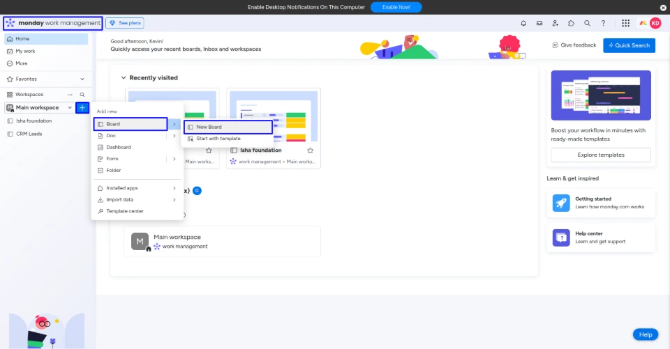 Now, from the Monday.com application, the user can create a new Board within the Main Workspace to organize and manage their data efficiently.