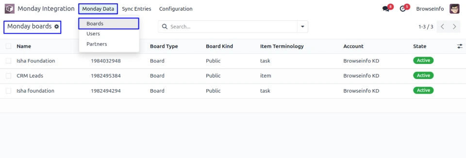 In the Monday Integration module, under the Monday Data menu, the Monday Board menu is visible.