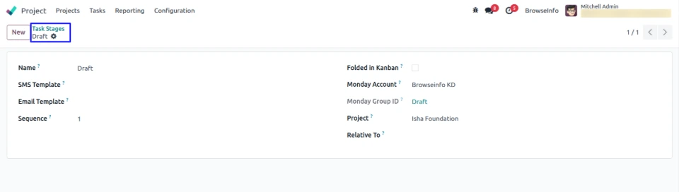 The user created a new task stage, selected the Isha Foundation project, and saved it. As a result, the Draft stage task was successfully created.
