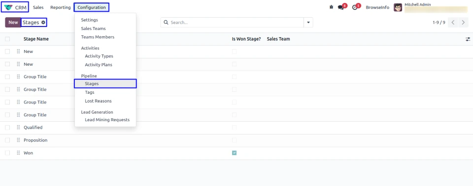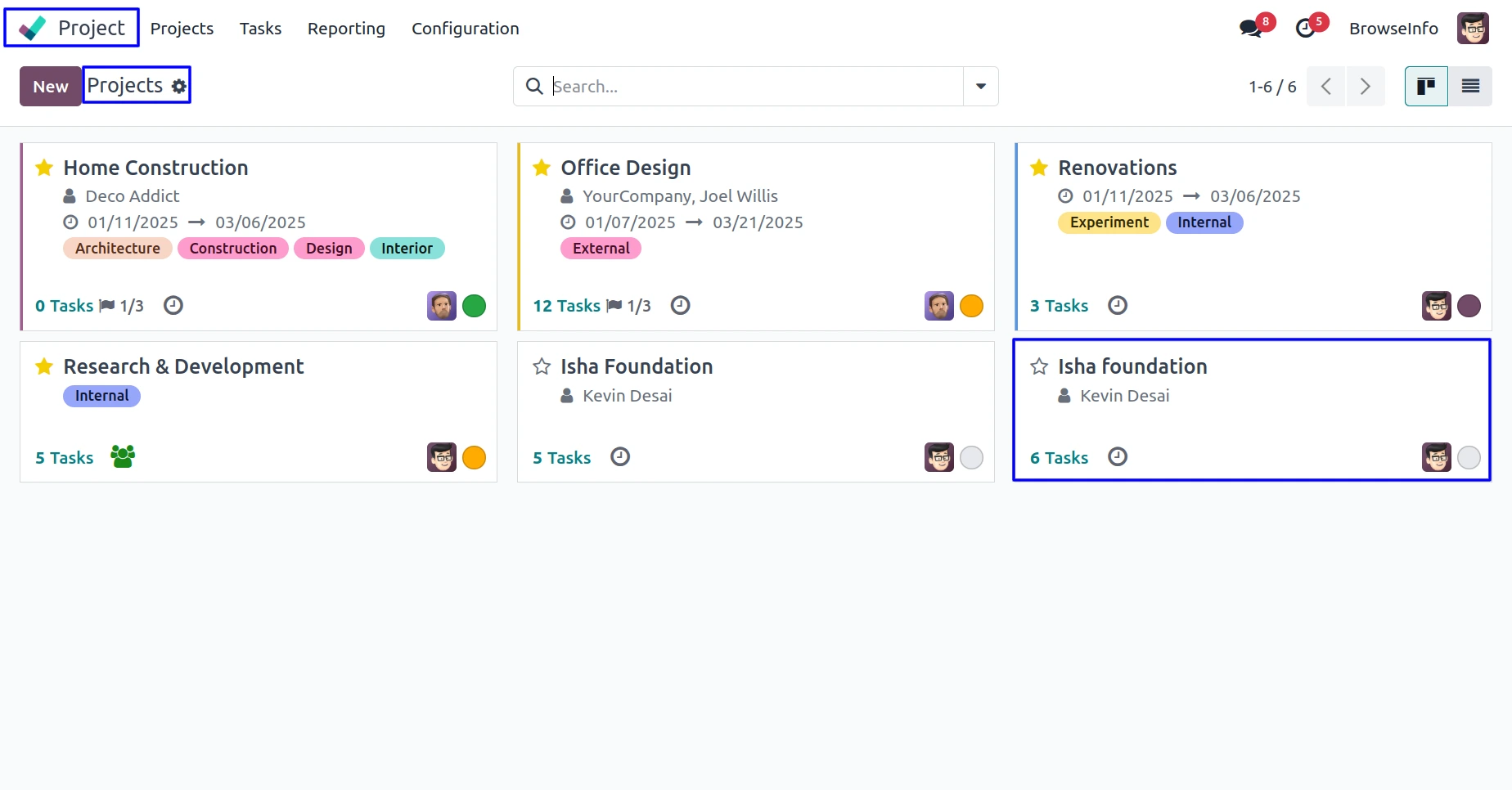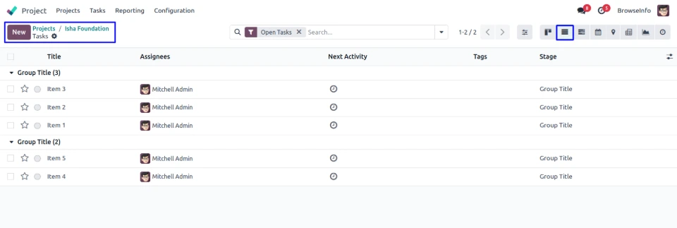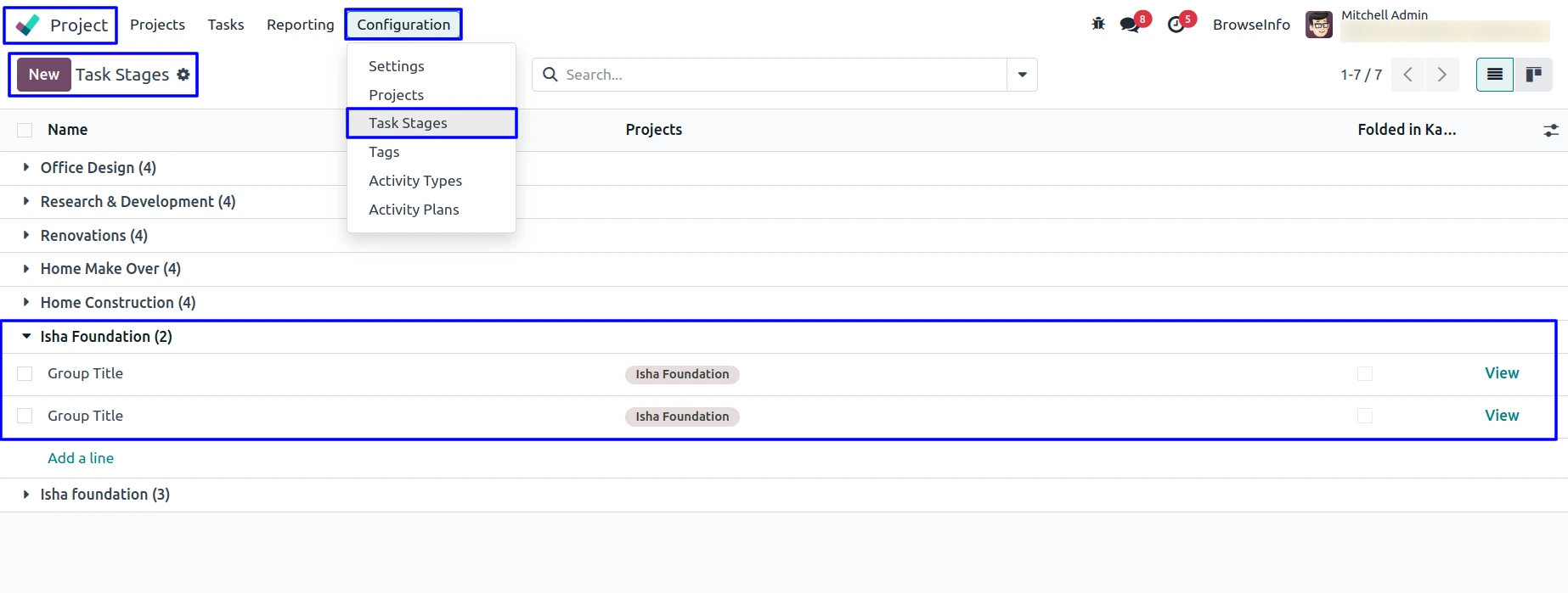 In the Project > Configuration > Task Stages menu, users can view projects in the list view.