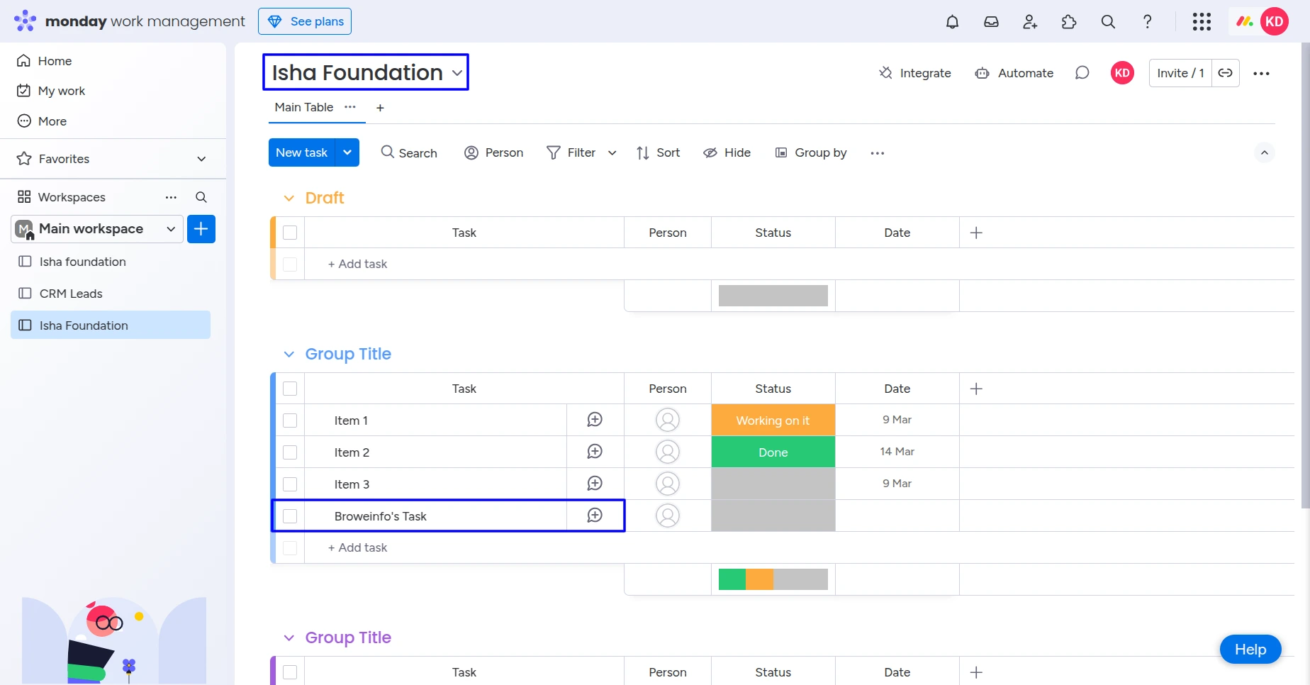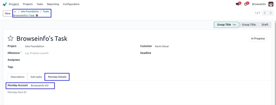 The user has created a new task under the Isha Foundation project and selected the Monday Account as Browseinfo KD.