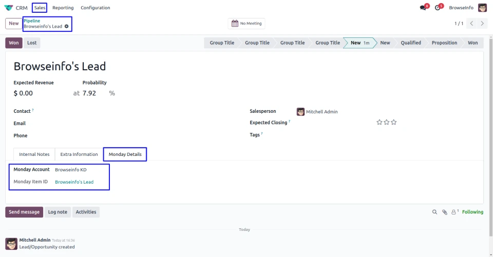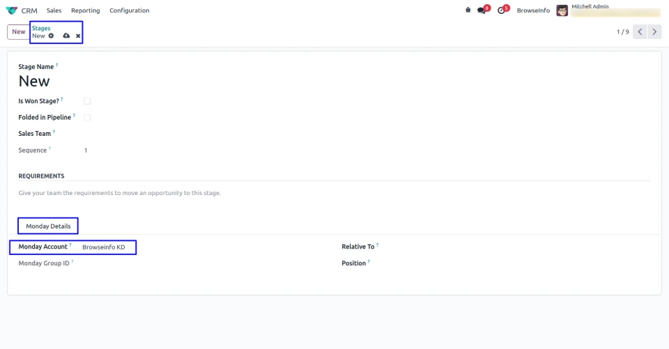 Here, the user can create a New Stage and select the Monday Account. After saving the information, the Monday Group ID data will be updated.