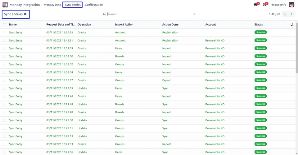 The Sync Entries section is visible under the Sync Entries menu. Here, the user can see all the synchronized entries, including details such as request date and time, operation type, import action, action performed, account, and status. All displayed entries have a Success status, indicating successful synchronization.