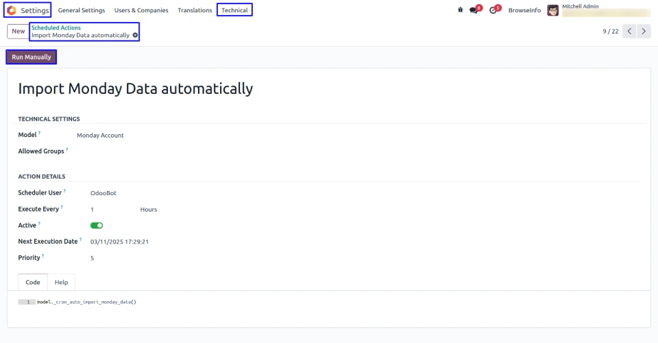 The Import Monday Data Automatically scheduled action is configured under Technical settings in Odoo. It runs every hour to import data from Monday Account, with an active status and a priority level of 5. The action can also be executed manually if needed.