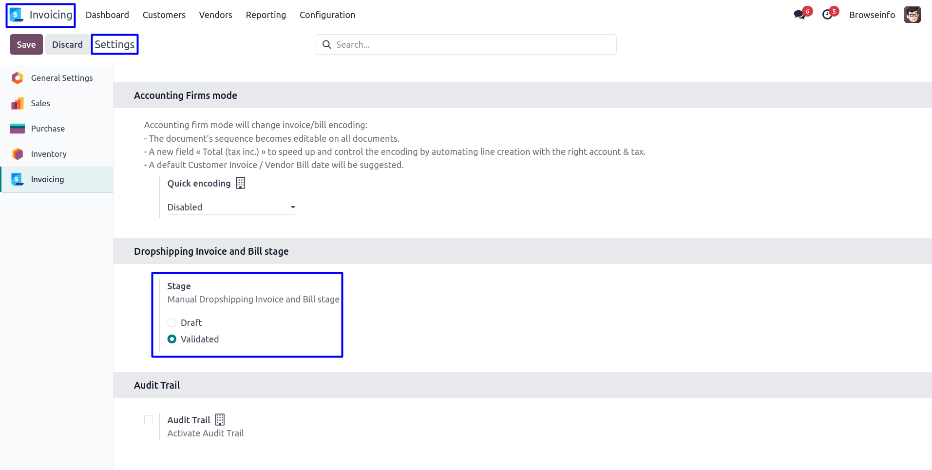 Under Invoicing > Configuration > Settings user have to select stage for for drop shipping invoice and bill.