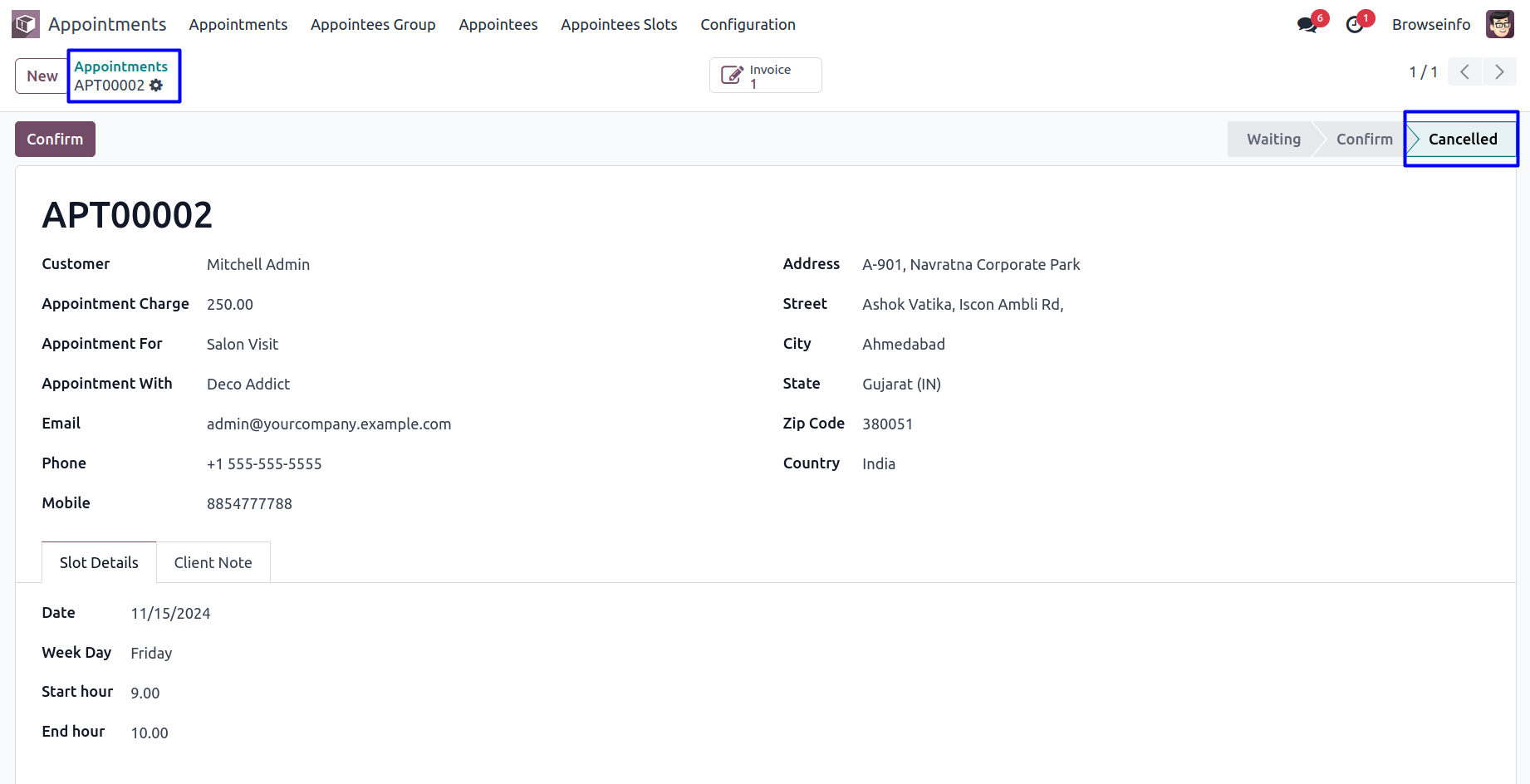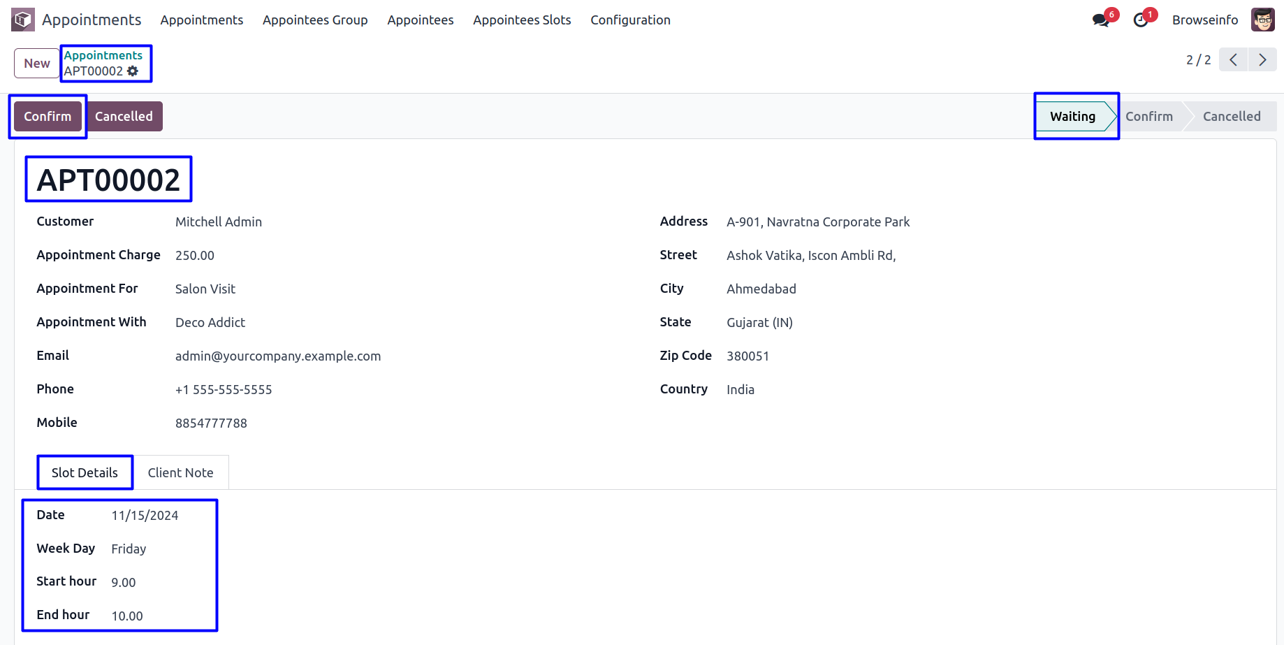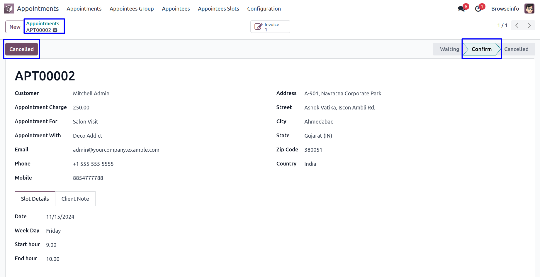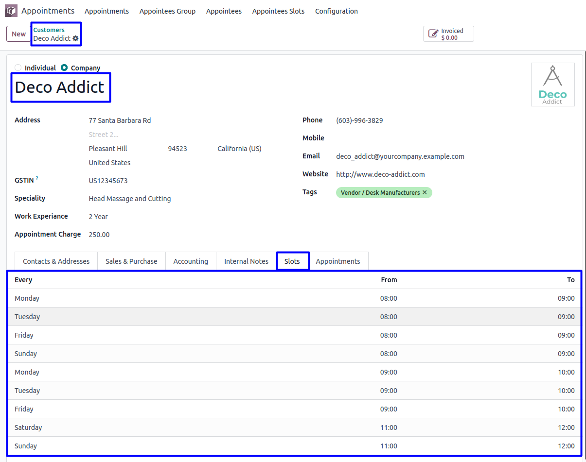 Appointee can view the created time slots for appointments and booked appointments with status in form view.