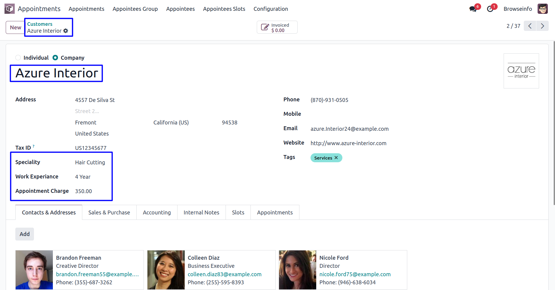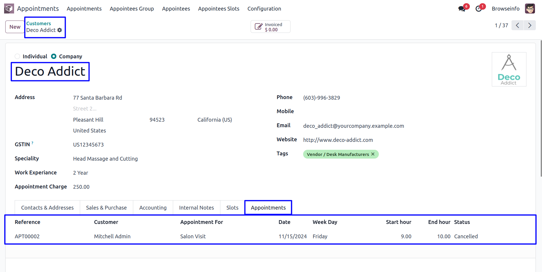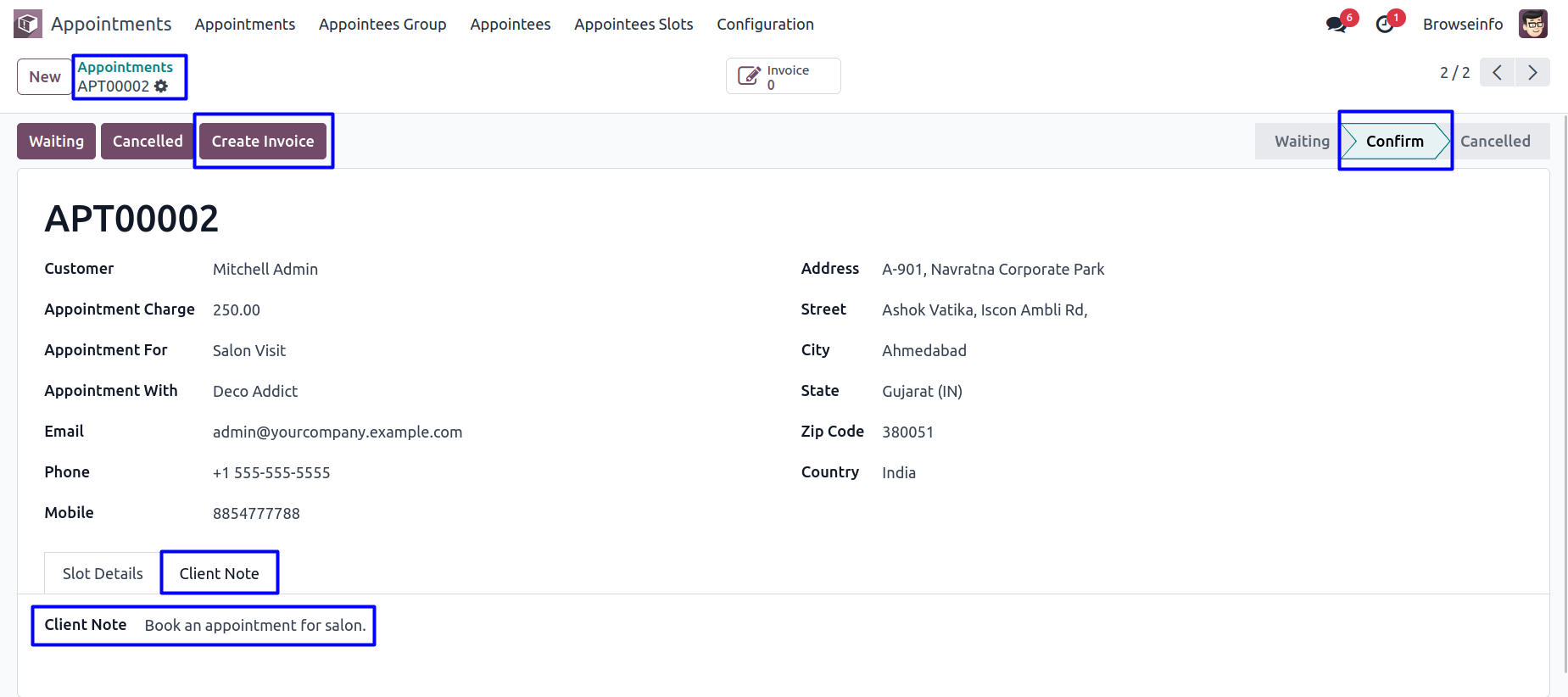 Appointee can view the created time slots for appointments and booked appointments with status in form view.