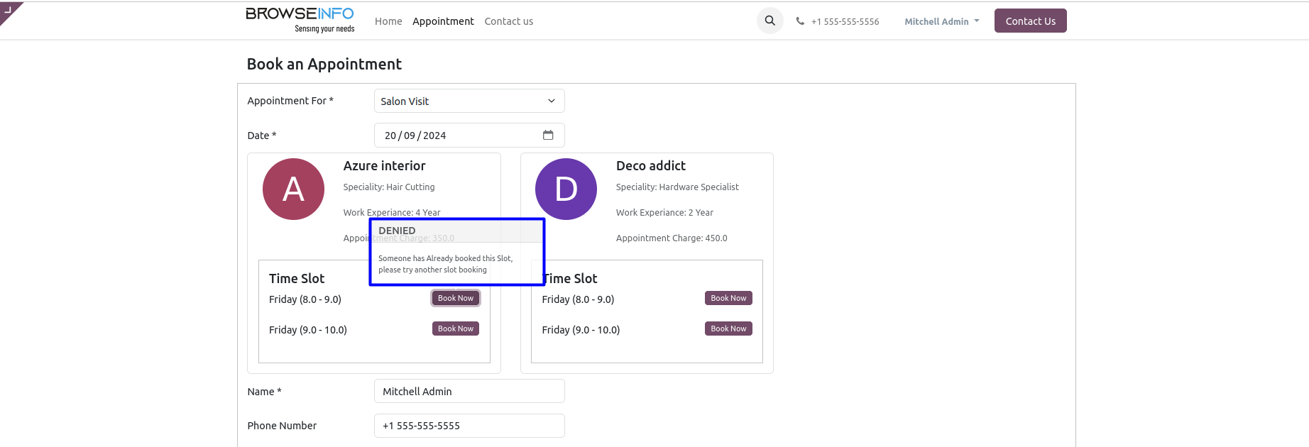 When user tries to book a time slot and if it is already allocated to someone else, Denied popup raised.