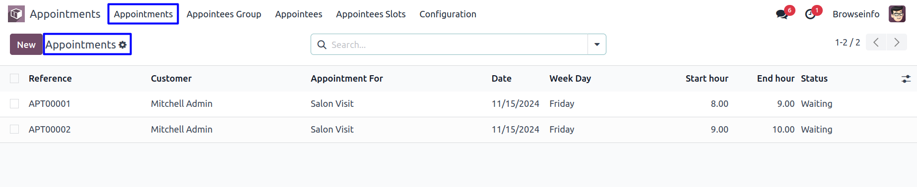 User can view the list of created appointments in the back-end.