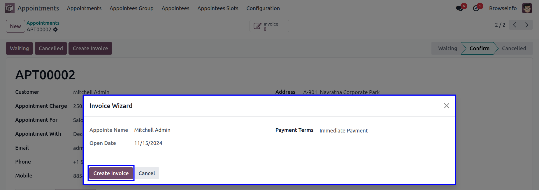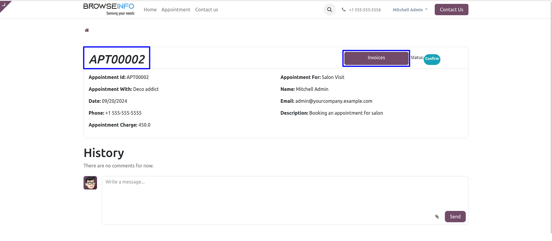 User can create an invoice of the appointment by clicking on 'CREATE INVOICE' button.