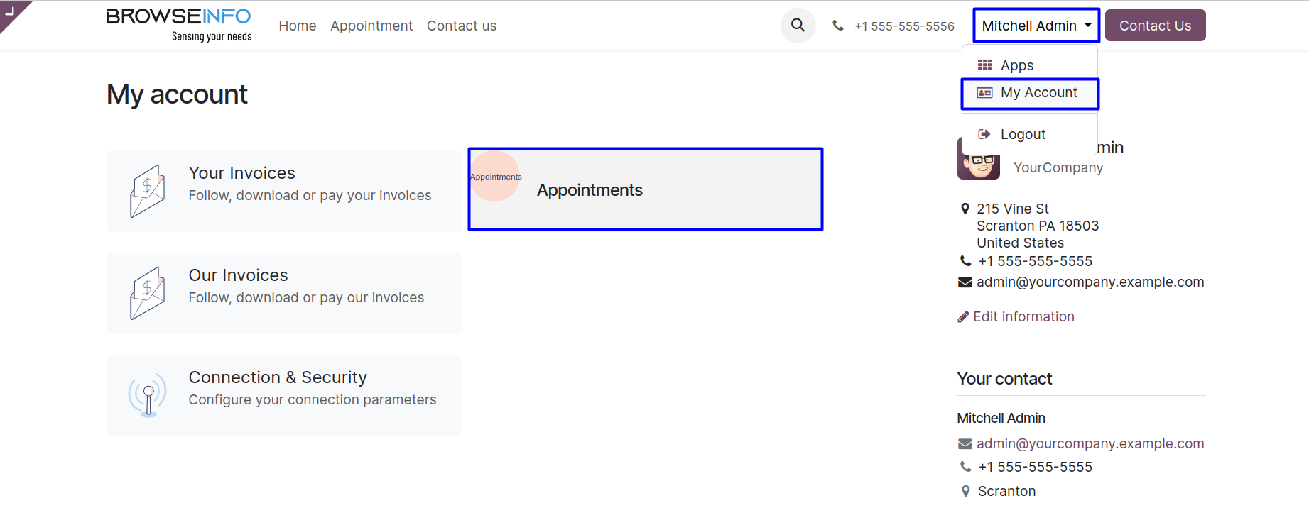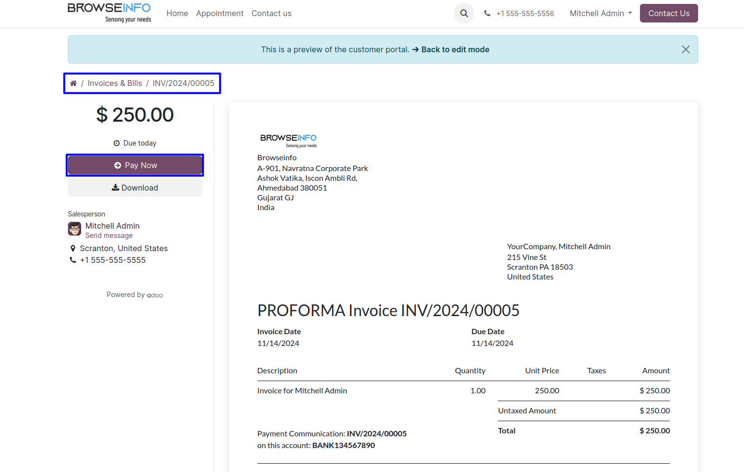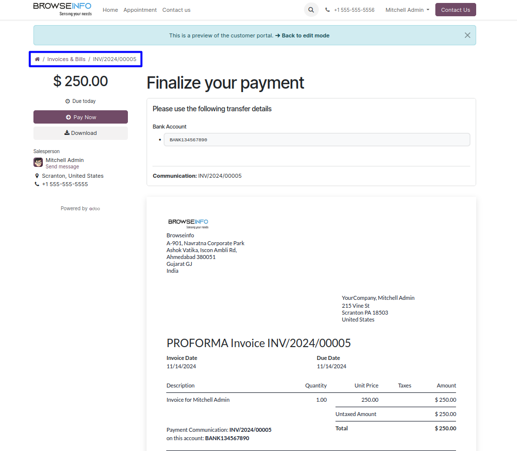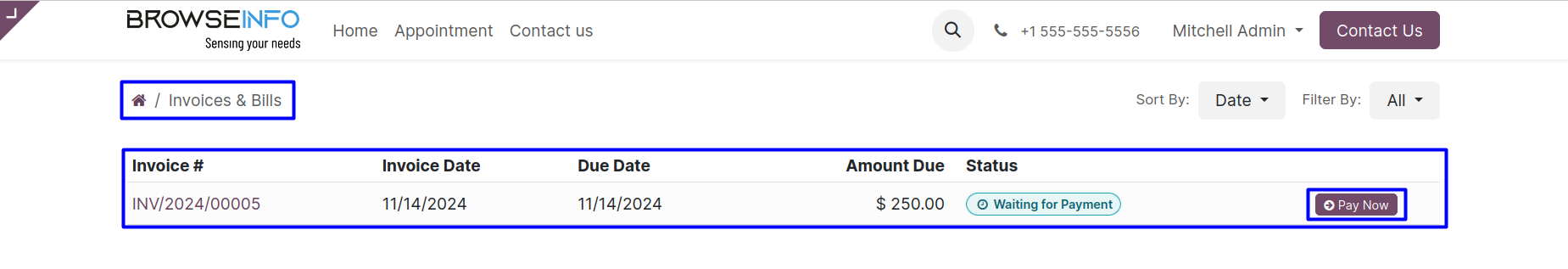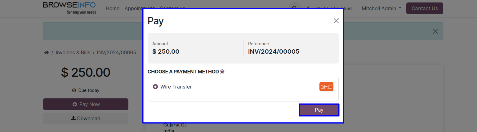 User can view the generated appointment invoices and pay it directly from the portal.