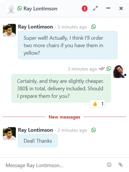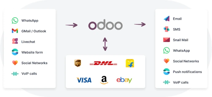 The only platform to unify all touchpoints in a single platform. It's so easy: just chat in Odoo Discuss, and messages are sent to the right channel automatically.