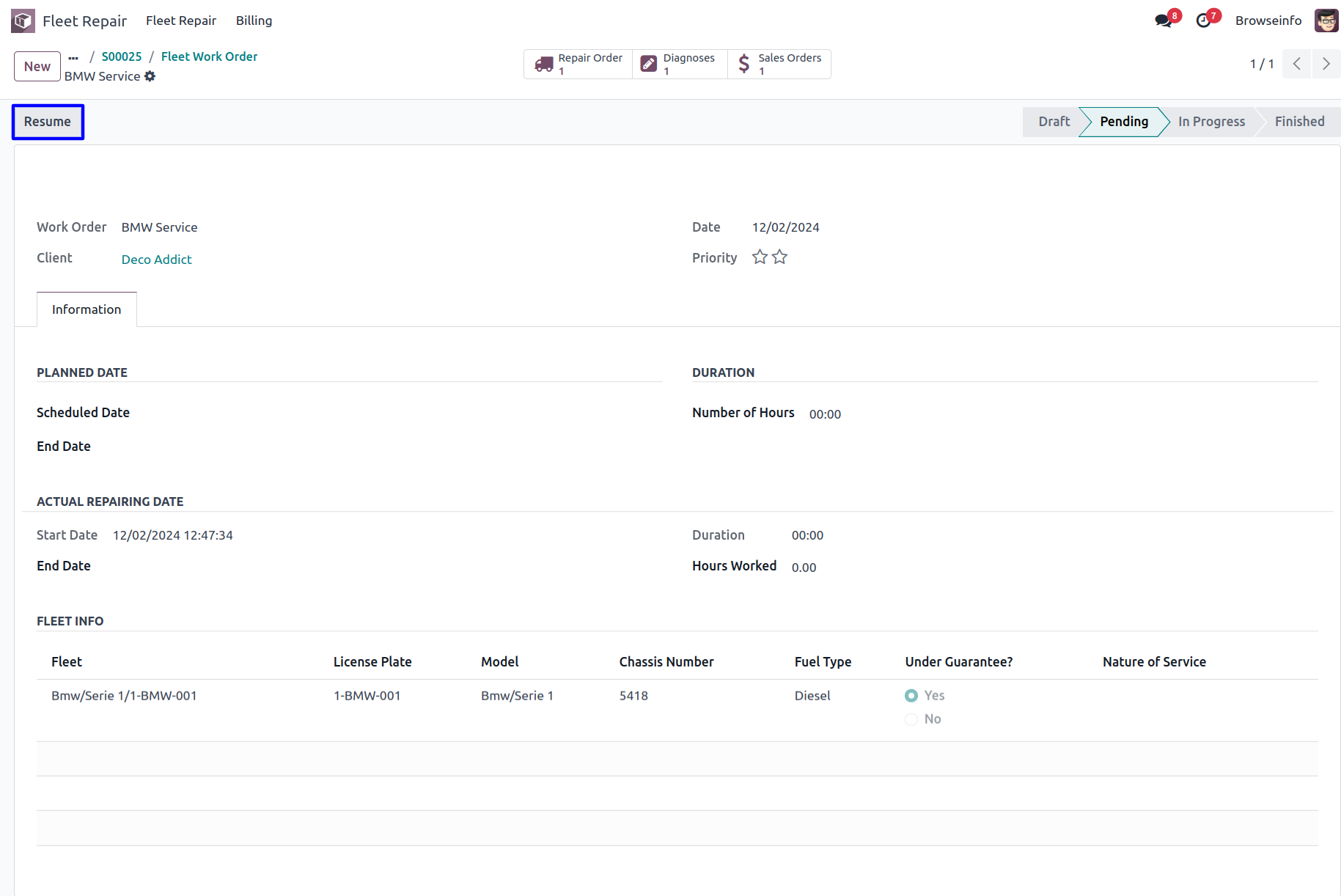 Now, worker will be able to start, pause , put in pending , cancel and finish the work order as per progress of the work on the Car. When work order is done, according to the hours spent on it, You will be given the option to generate the Invoice on related Sale Order.