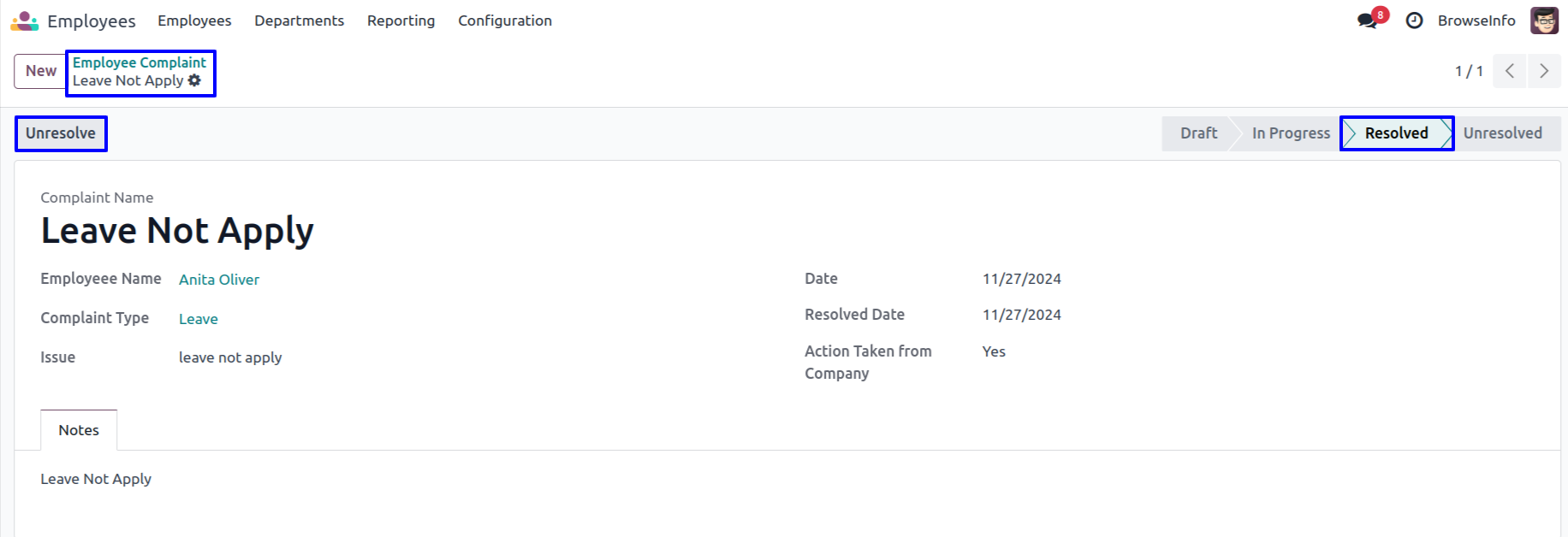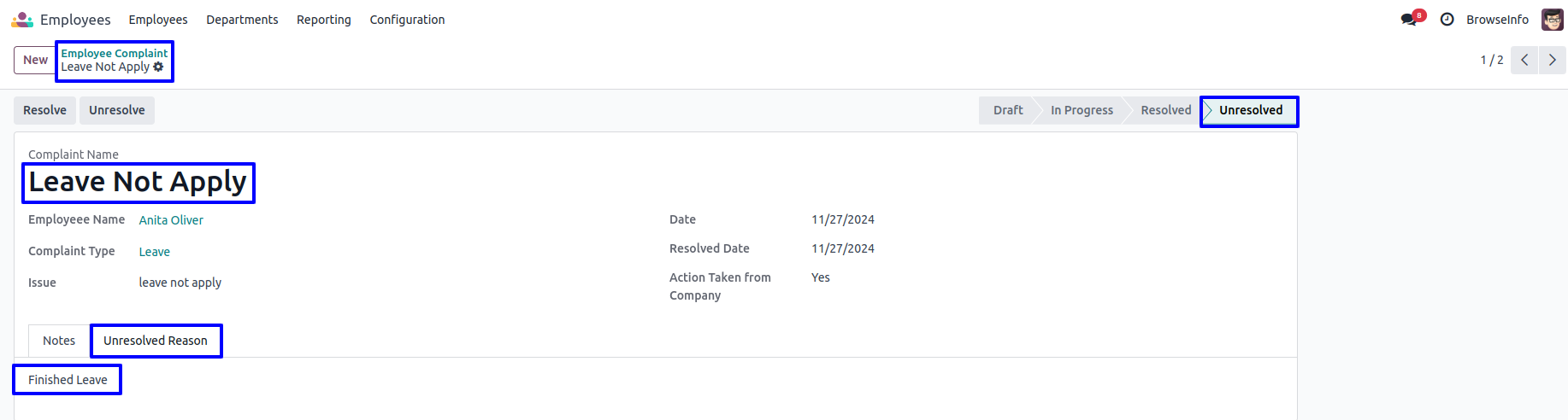 User can unresolved employee complaint by clicking on 'UNRESOLVE' button.