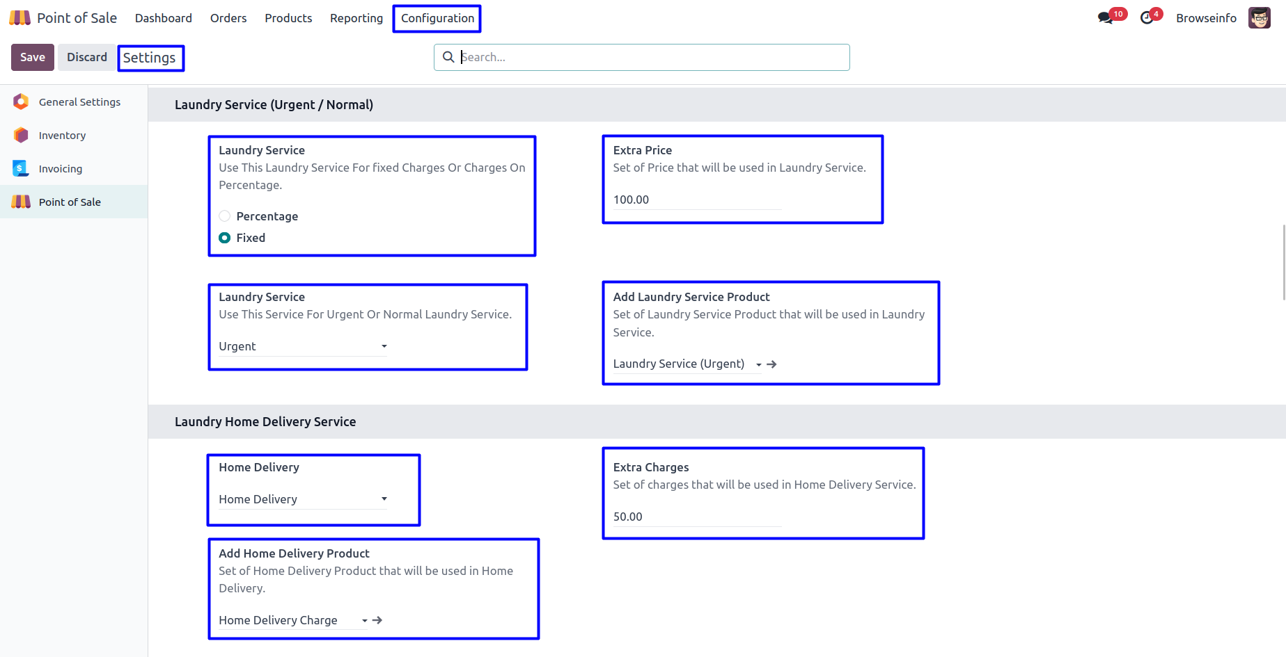 User can configure the laundry service for fixed charges or percentage charges.