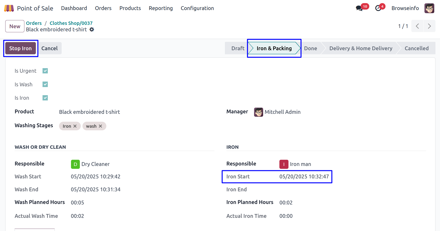 Once iron done, Iron person can stop iron by clicking on 'STOP IRON' button and view the start or stop time and actual iron time.