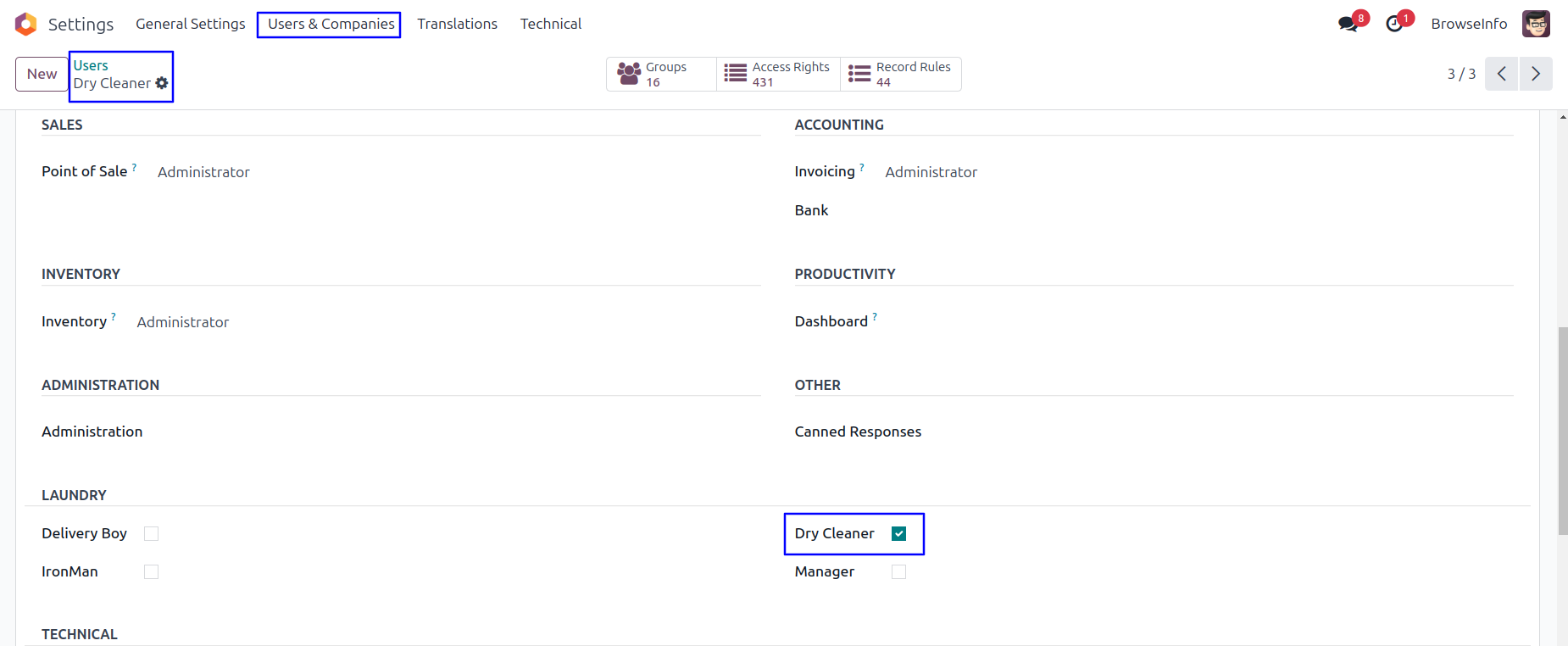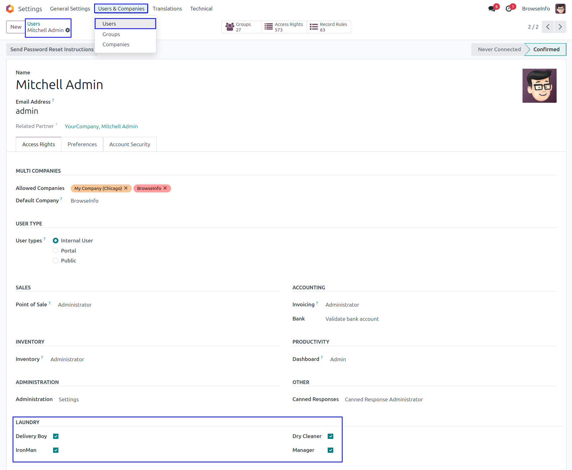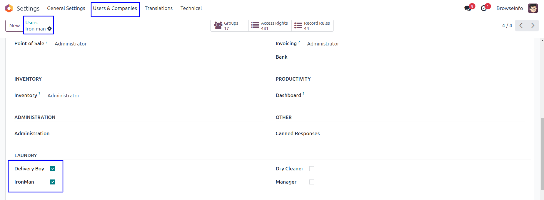 Under user configuration give an access rights for 'Delivery Boy', 'Dry Cleaner', 'IronMan' and 'Manager' for laundry management.