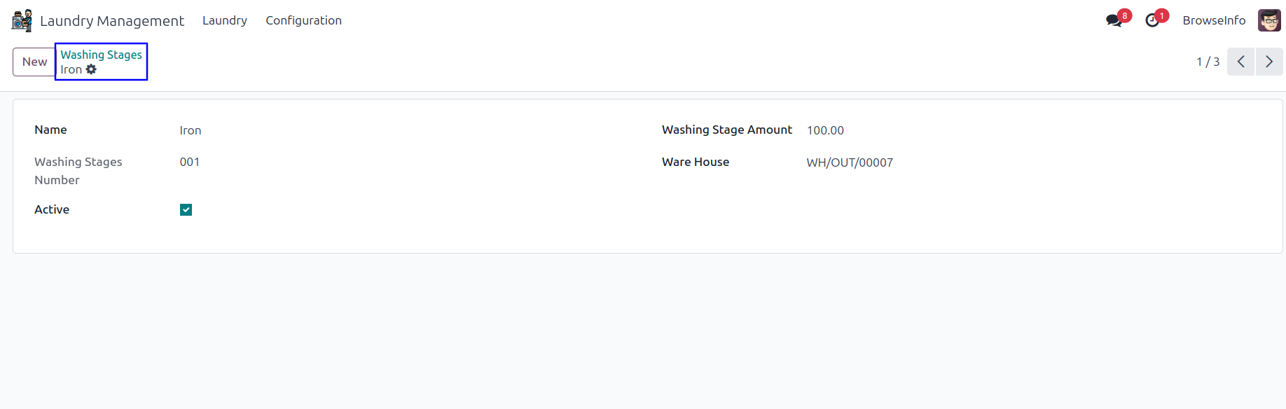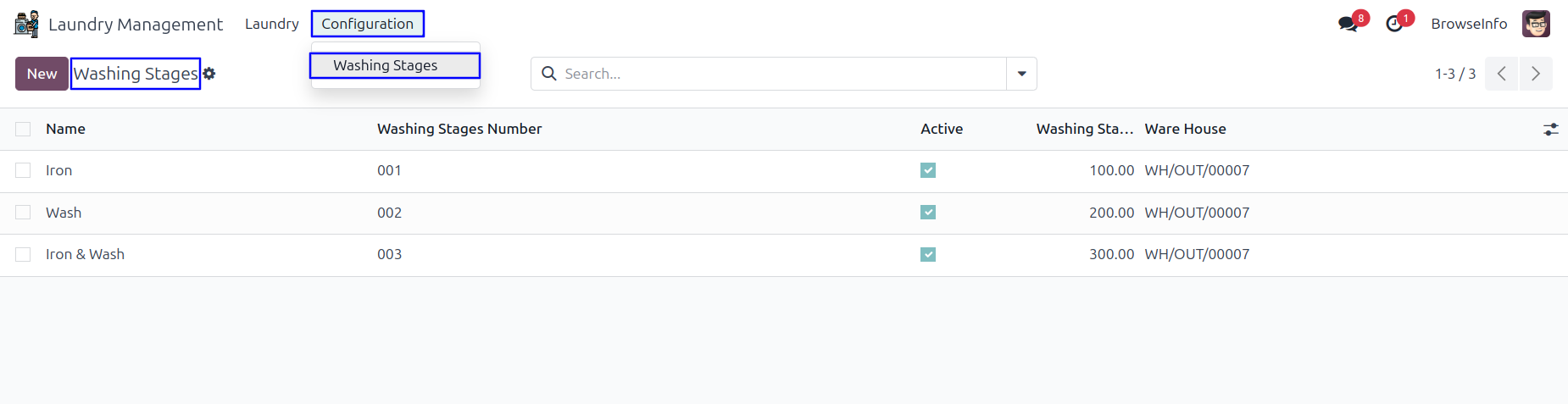 Goto Laundry Management -> Configuration -> Washing Stages menu in that create a washing stages with their amount and warehouse.