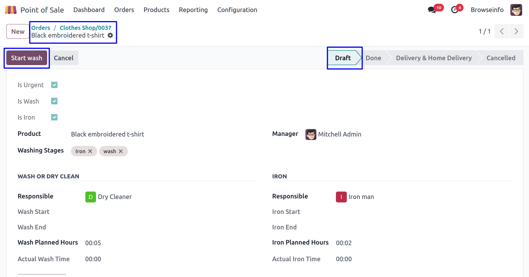 Dry cleaner person can start washing by clicking on 'START WASH' button.
