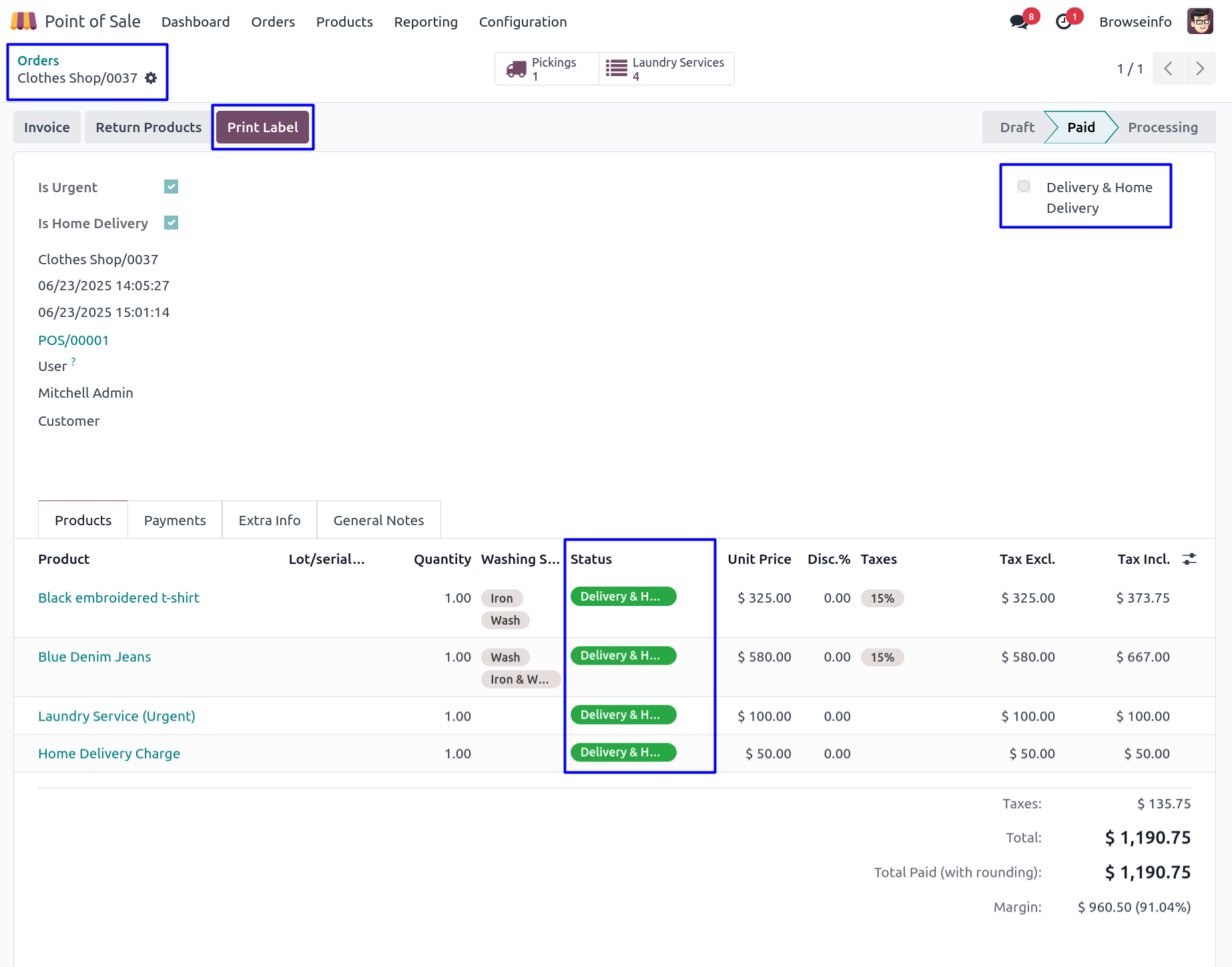 User can print the label of laundry order by clicking on 'PRINT LABEL' button.