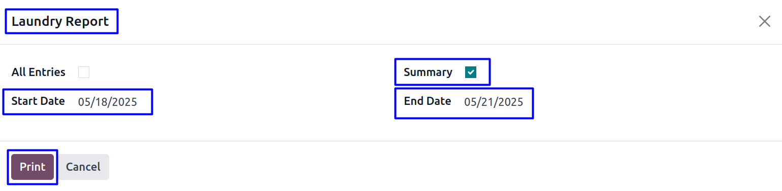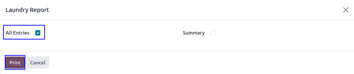 User have option to print all entries of laundry report by clicking on 'All Entries' checkbox.