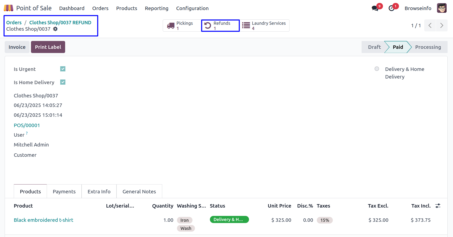 User can view the refunded laundry order.