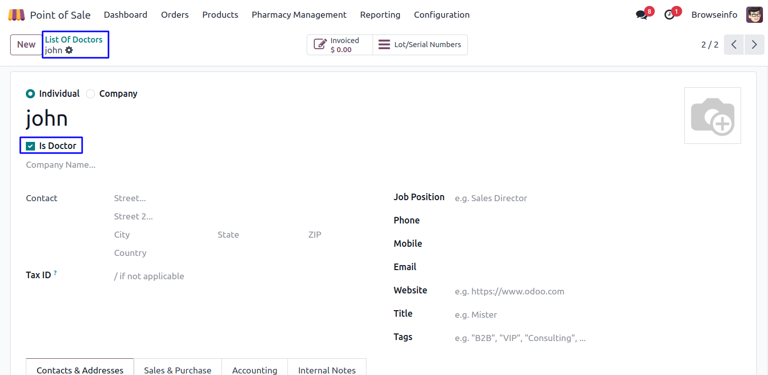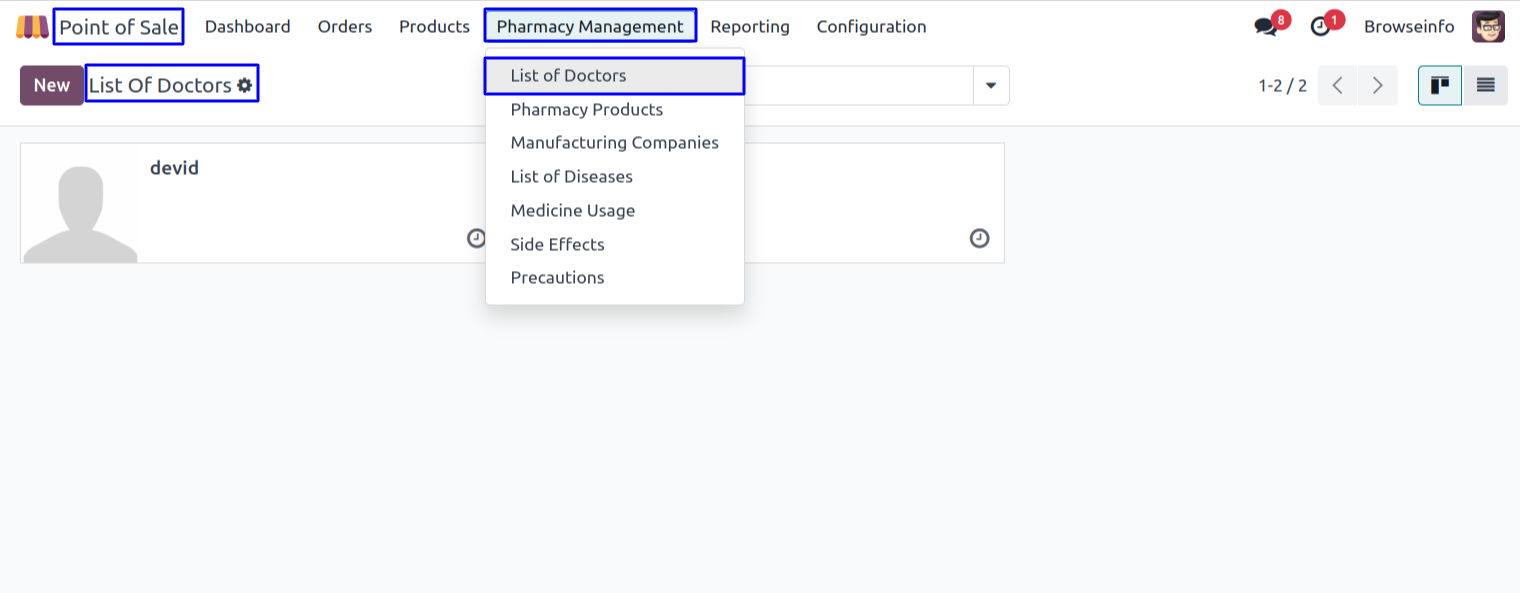 Under Point of Sale > Pharmacy Management > List of Doctors menu in that user can create the doctors.