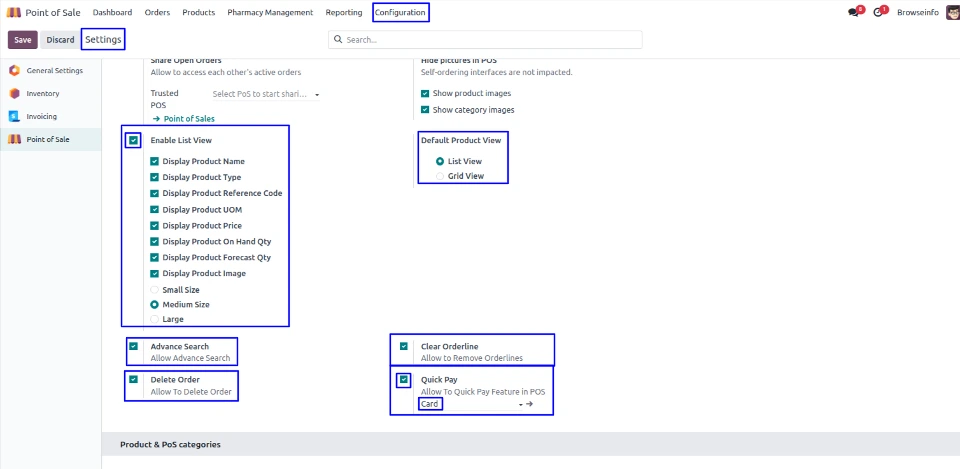 Under POS configuration, User can enable list view and enable/disable display product name, product type, product reference code, product UOM, product price, product on hand qty, forecast qty, product image as small size, medium side and large size.