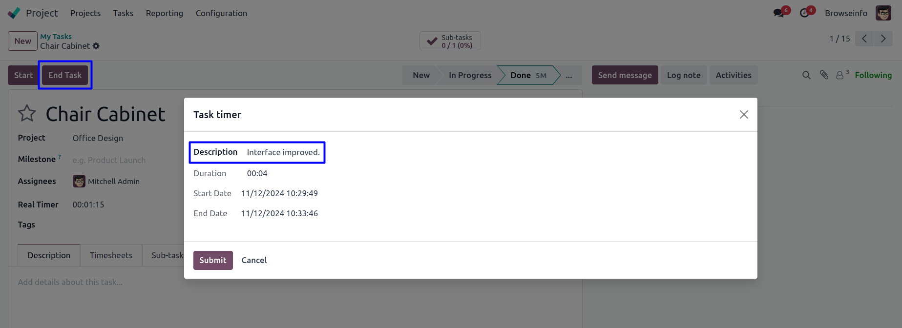 On clicking "END TASK" button new pop-up will open, Here user can enter description for timesheet, see timer duration, start date time and end date time of timer.