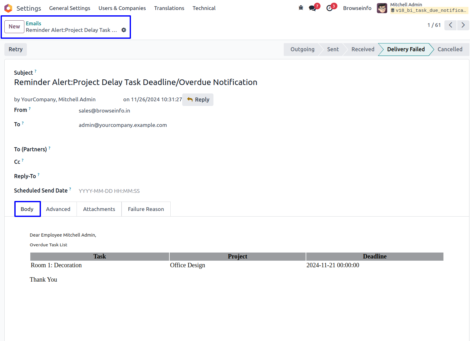 Email for Project Delay Task Deadline/Overdue Notification