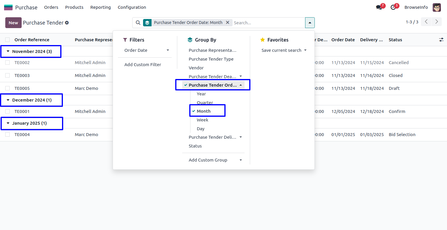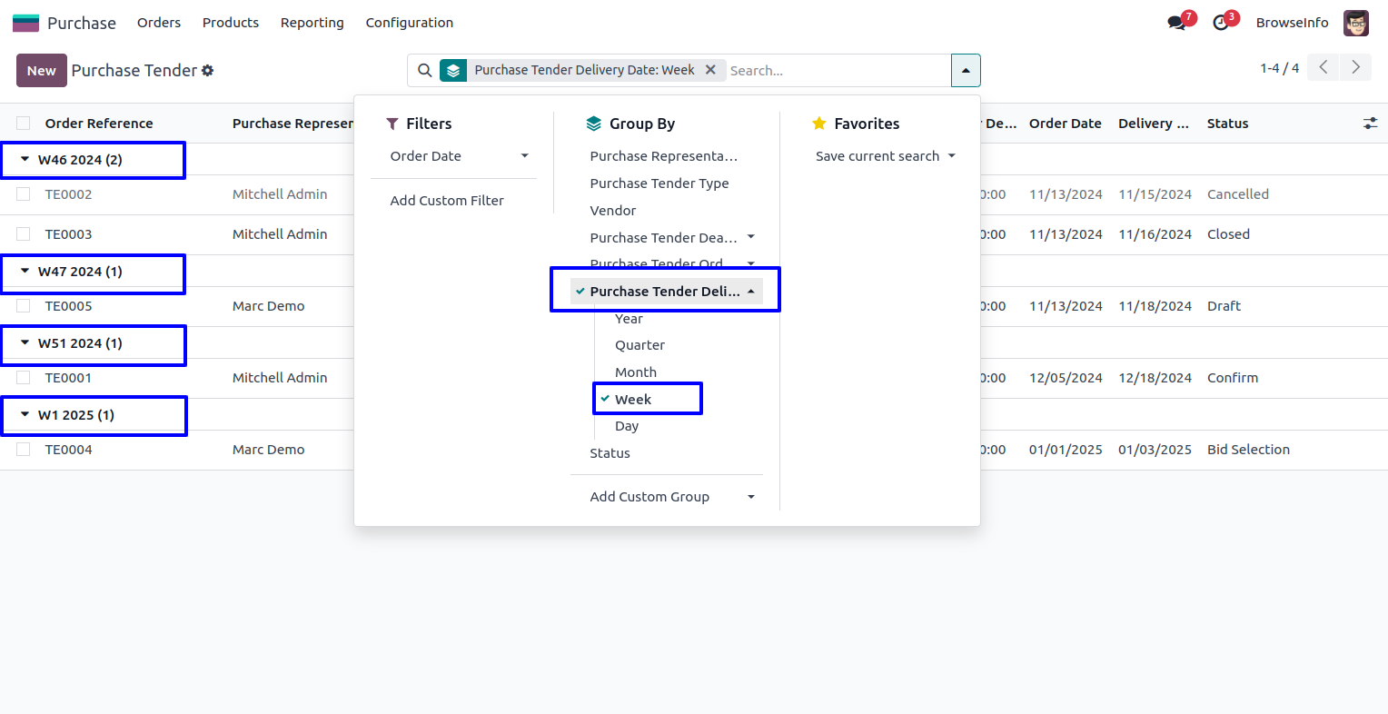 User can group purchase tender by purchase tender delivery date.