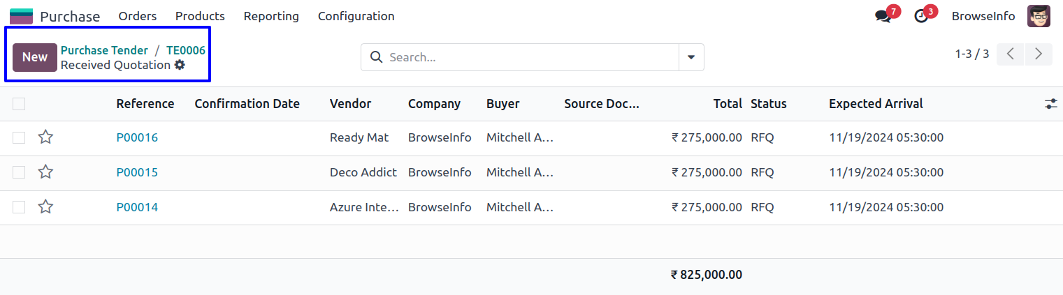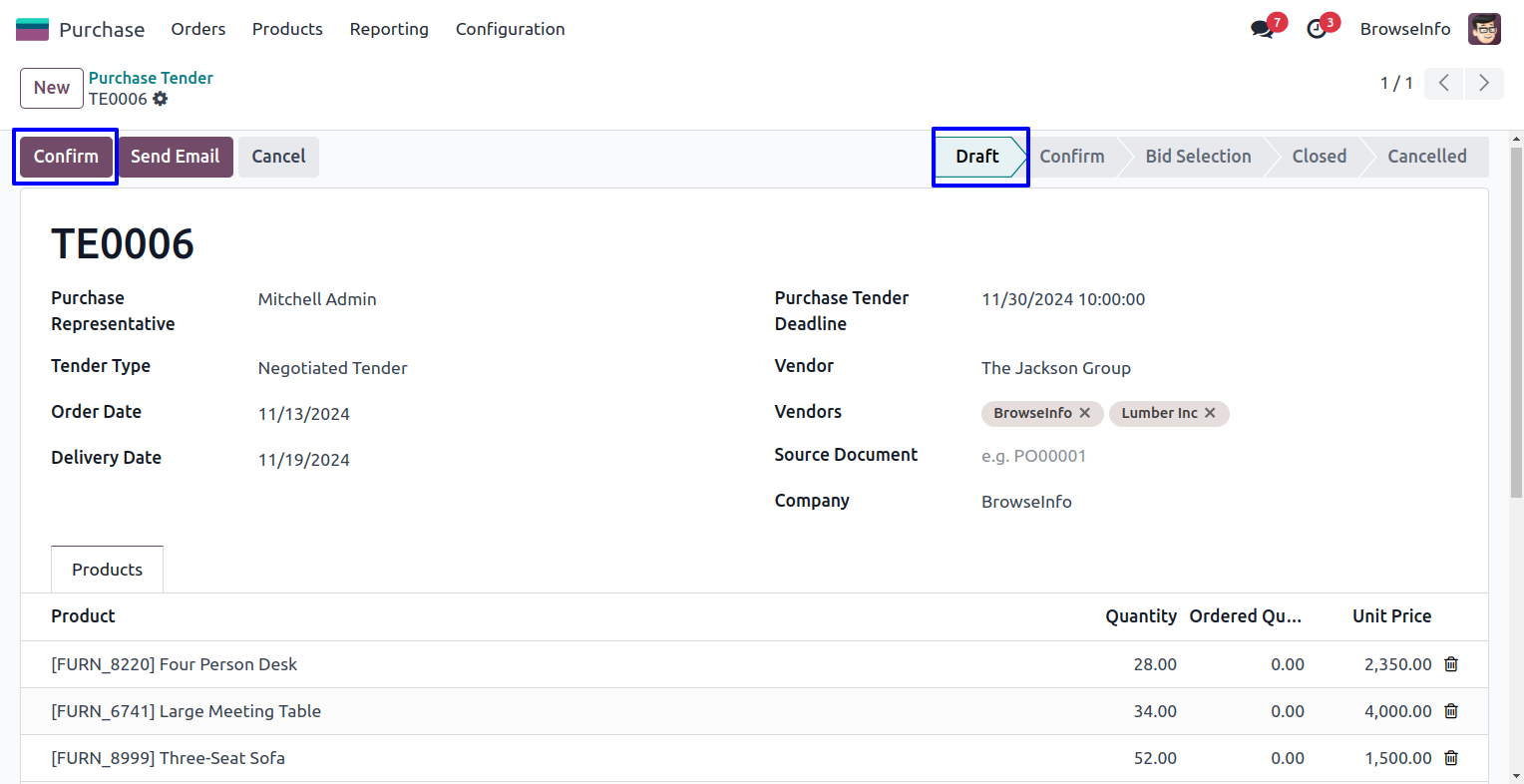 Purchase Tenders in Form View