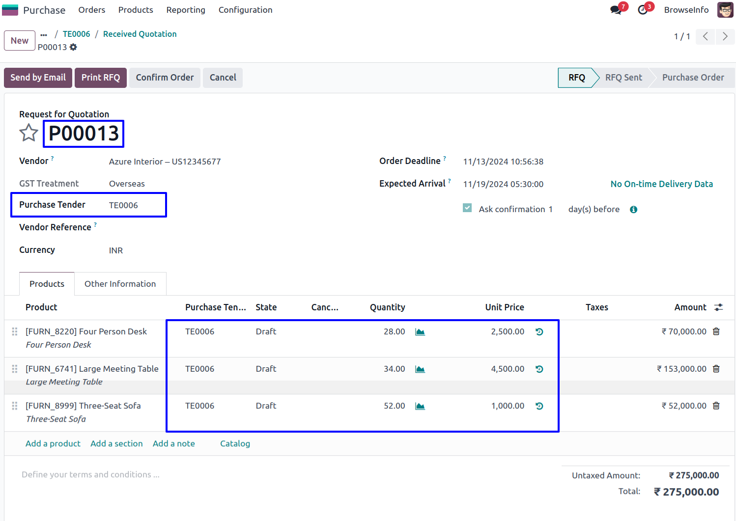 User can inspect request for quotation of purchase tender by clicking "INSPECT RFQ" button, user will see all line of rfq for product with vendor, product, price, and quantity.