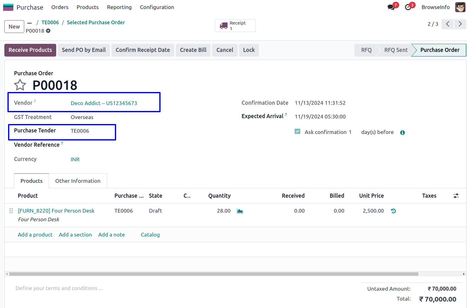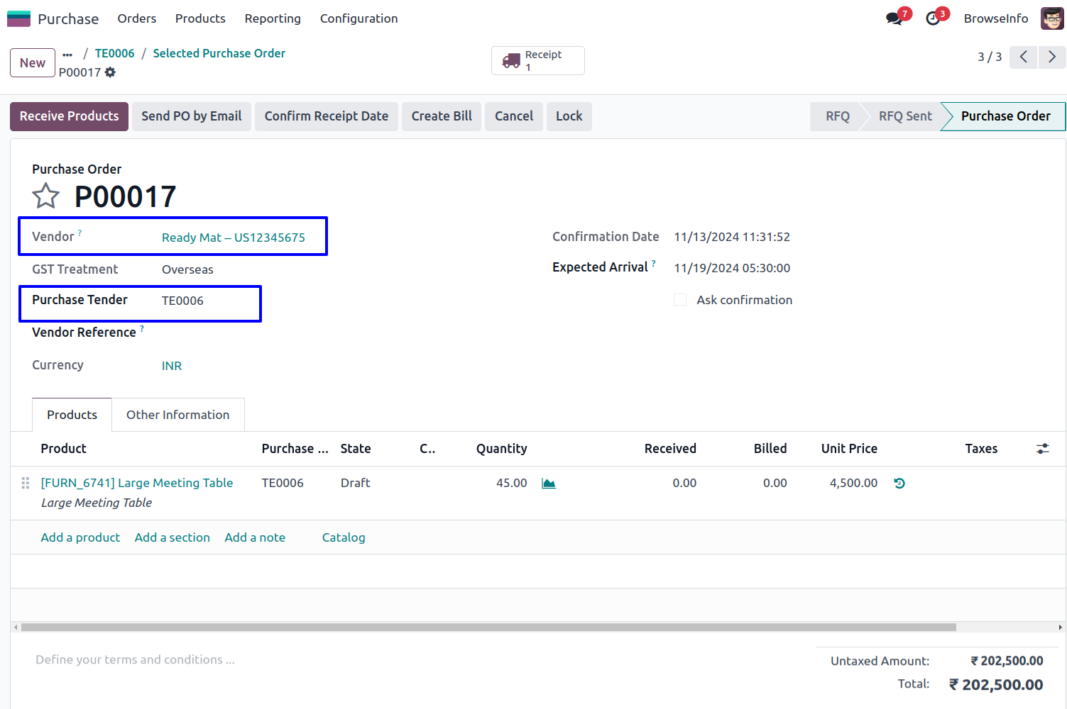 Under Purchase > Orders menu user can see "Purchase Tender" menu.