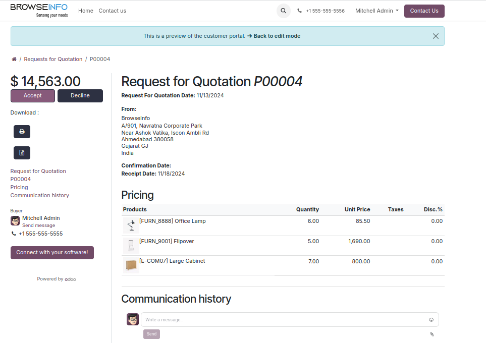 User can see the requests for quotation in the portal and also download RFQ in PDF and XLS file format.