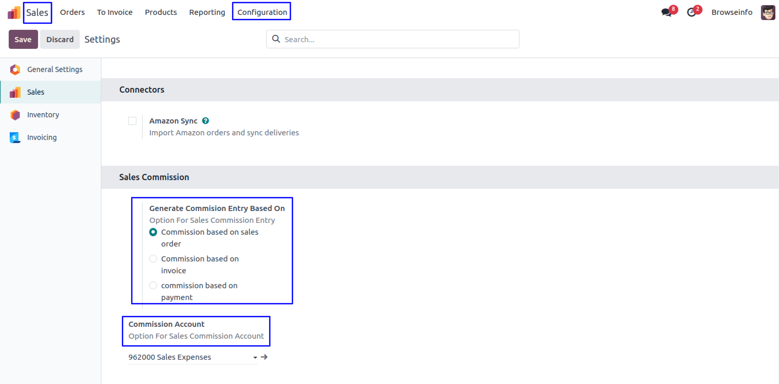 Under Sales > Configuration > Sales Commission menu manager can create different types of commissions.