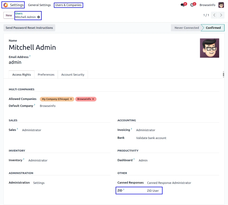 Go to Settings > Users & Companies > Users, in that set up the ZID configuration.