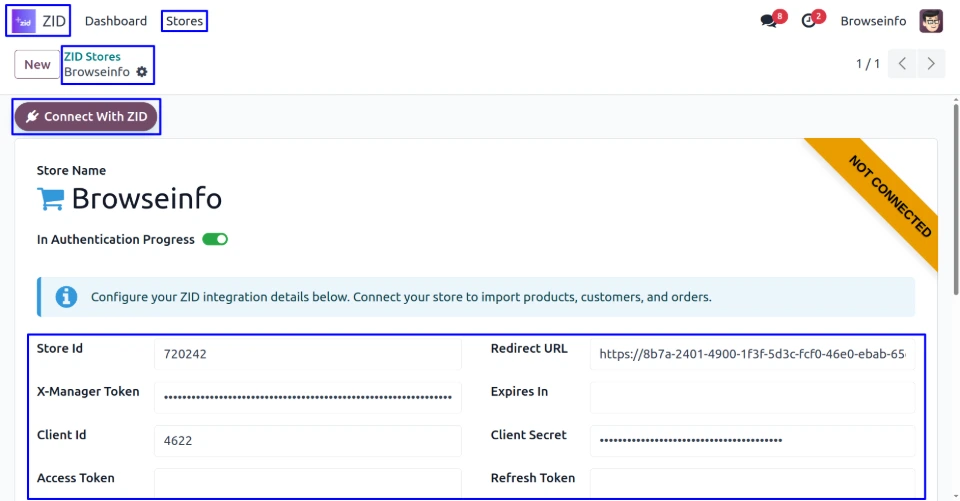 After entering all required credentials, The ZID store status changes to CONNECTED, and user will see a confirmation message.