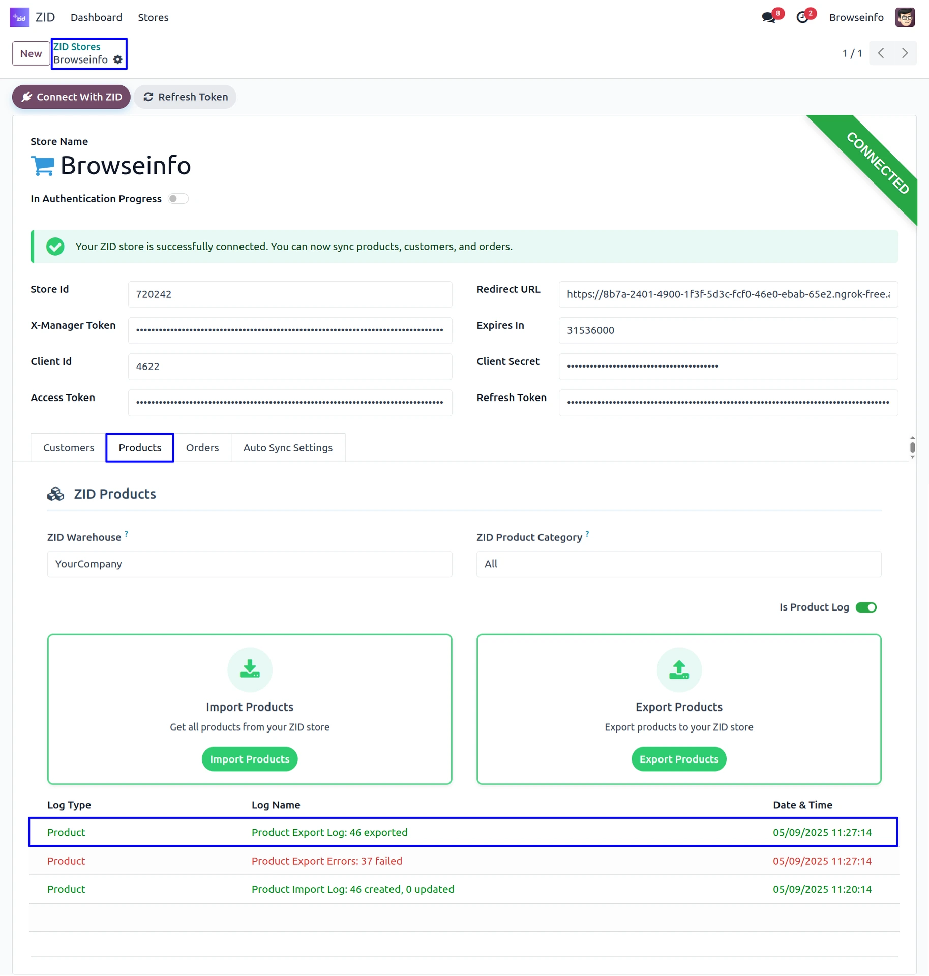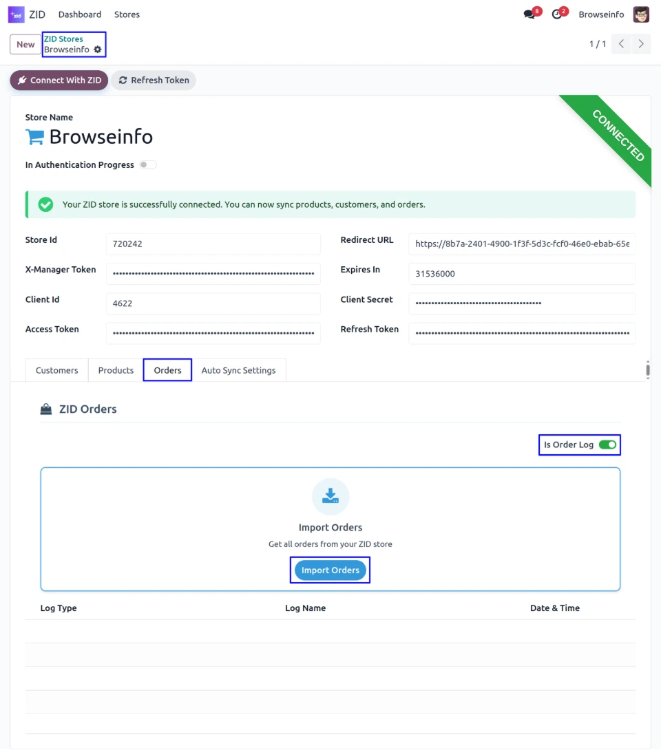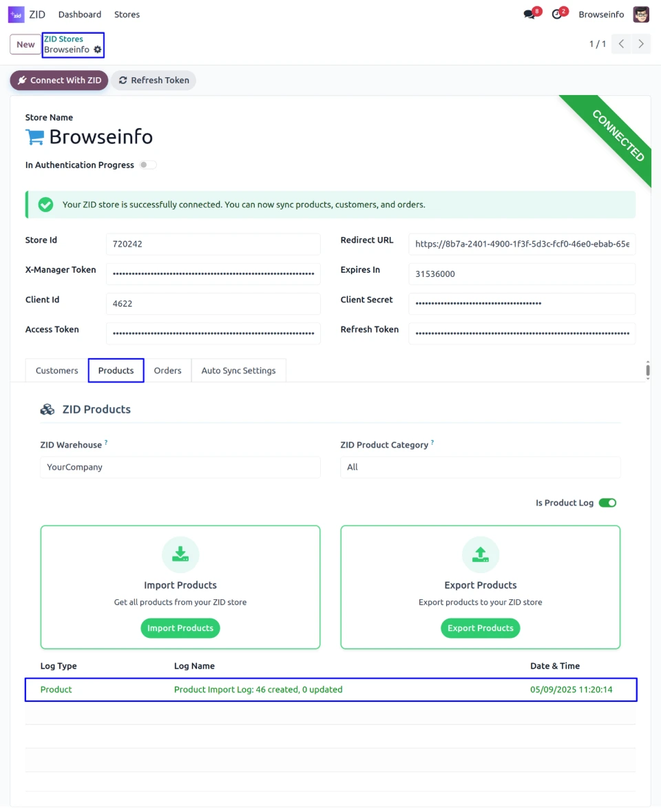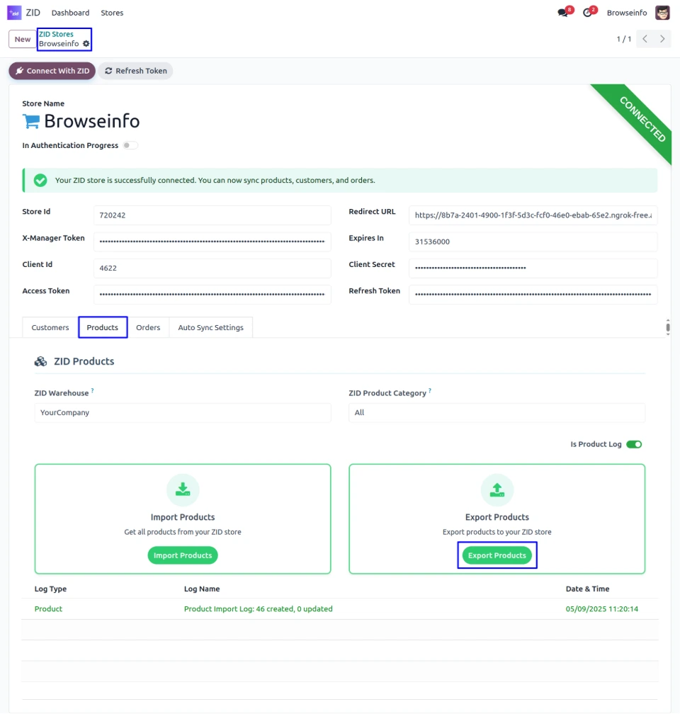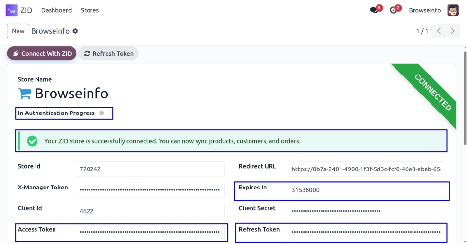 Once the store is successfully connected, The system automatically generates the Access Token, Refresh Token, and Expires In values, completing the authentication process.