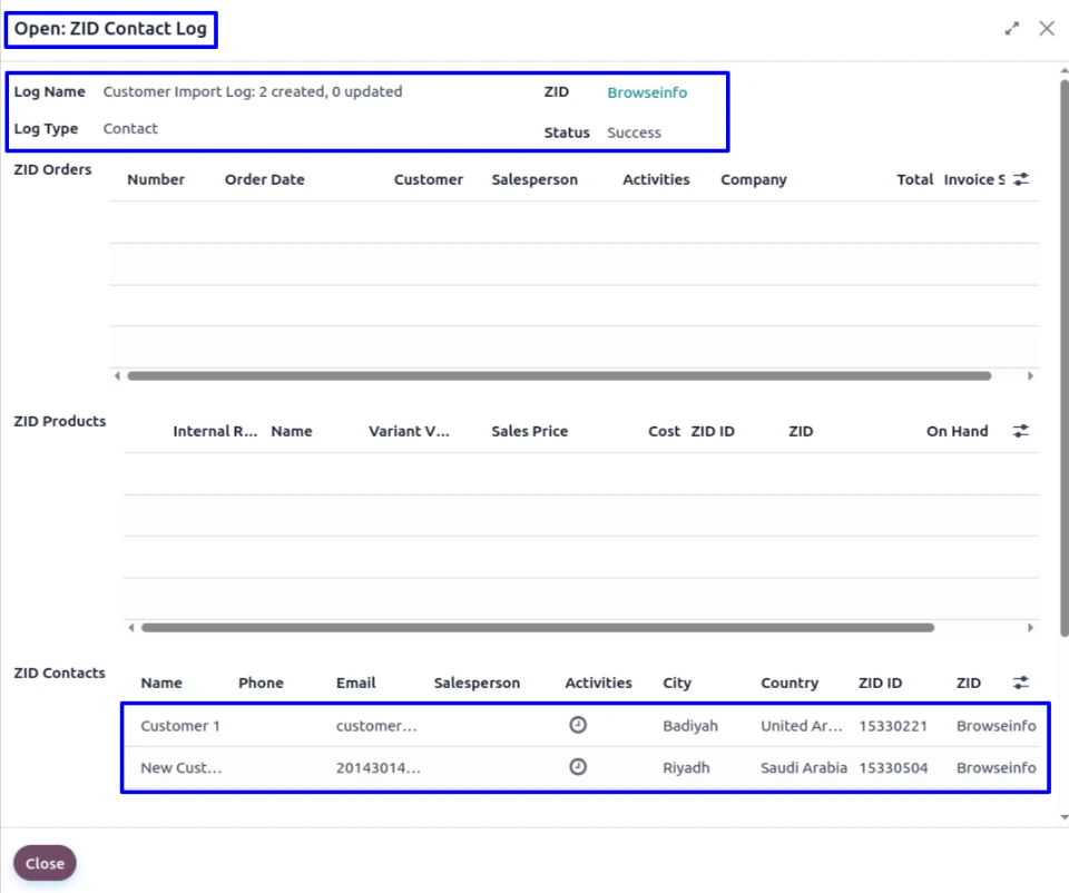 In the wizard, the user will be able to view a list of customer contacts, organized by ZID code, After clicking on the log entry for the imported customer.
