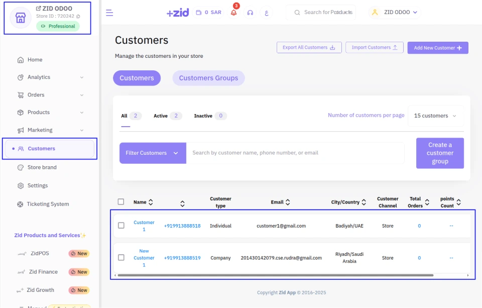 In the ZID Admin Portal, Under the Customers menu, Users can view the customers they have imported into Odoo.