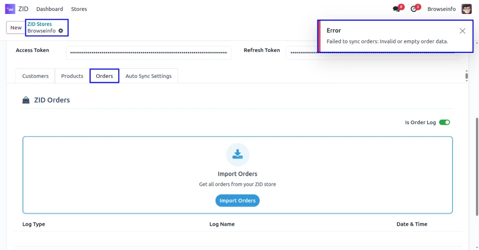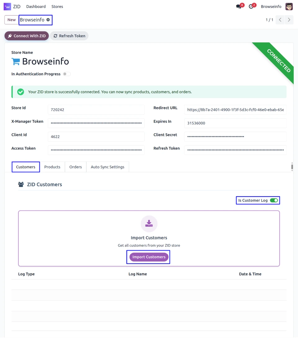 Under the Customers tab, When "Is Customer Log" toggle is enabled, The ZID Customers log section becomes visible. Now, User can click the Import Customers button to fetch and import all customers directly from user ZID store into Odoo.