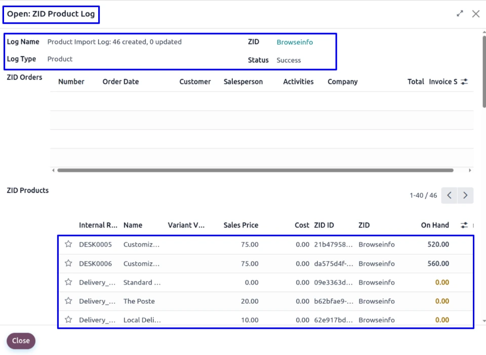 In the wizard, The user will be able to view a list of product, organized by ZID products, after clicking on the log entry for the imported customer.