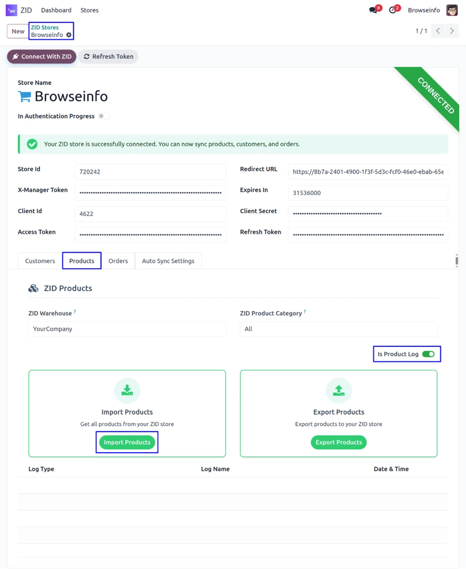 In the Product tab, User must first enable the "Is Product Log" field. After that, They can click on the Import Product button to import products from ZID into Odoo.